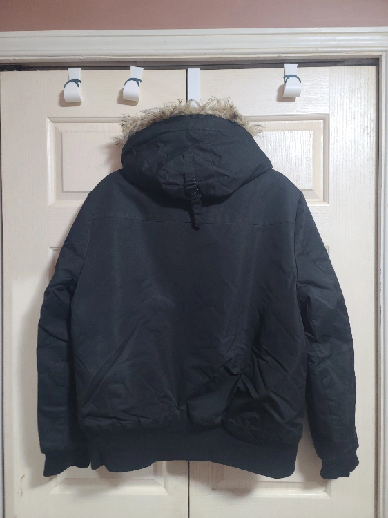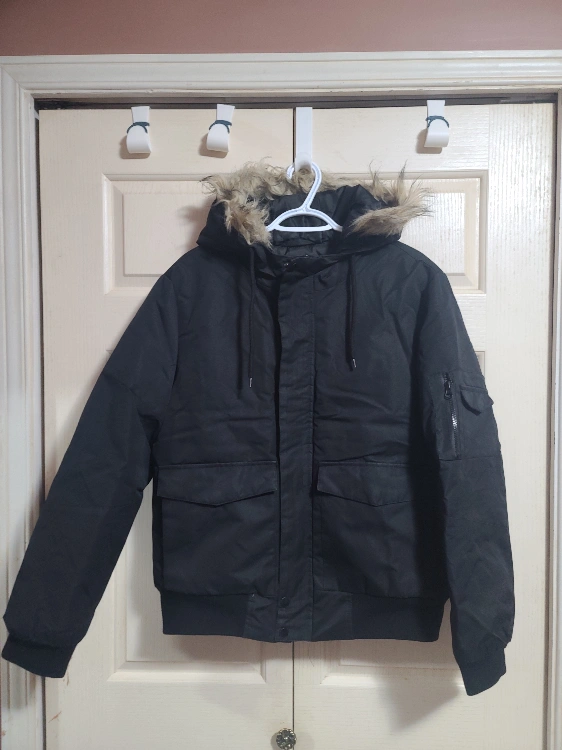 Black winter jacket with a fur-lined hood. Detachable Faux-fur. Haven't use it since last Fall. I just pulled it out of a vacuum sealed bag. Pick up near BCIT Burnaby