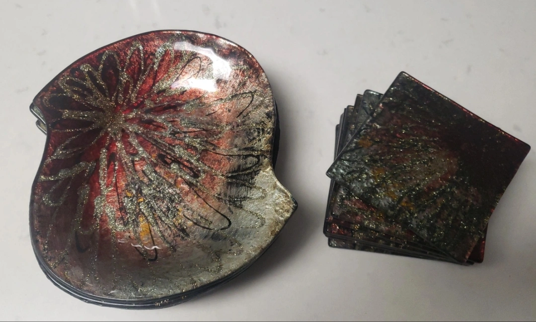 Brand new and handcrafted with foiled glass. A beautiful set of 6 plates, 8 coasters, and 2 serving platters. **Please note that pick up would have to be in the Woodbridge/Vaughan area. Check out my other listings to get a bundle offer.