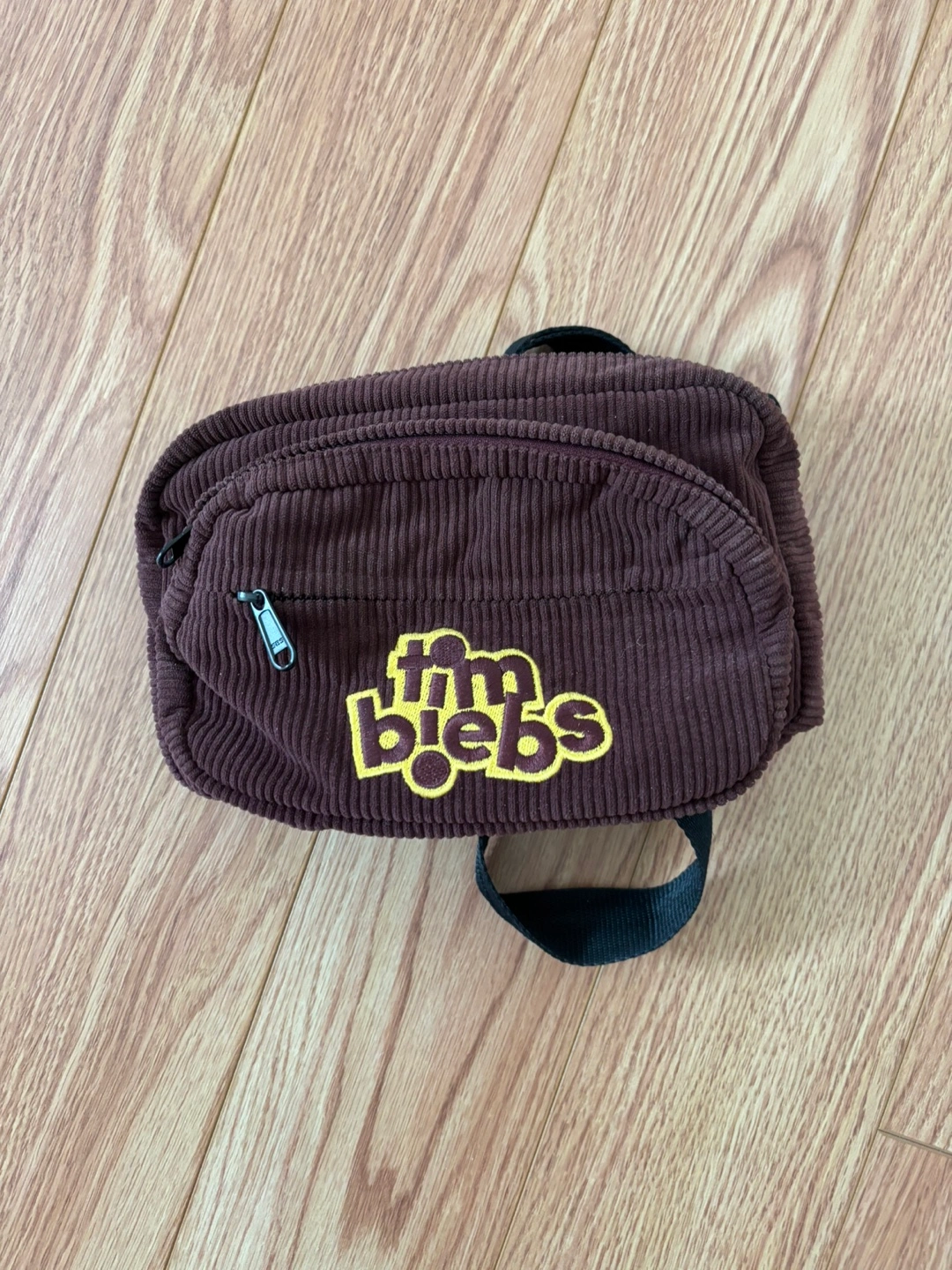 Brown corduroy bum bag with Justin Bieber logo. In great condition. Adjustable strap. Cash and pick up ONLY Won’t respond to unreasonable offers
