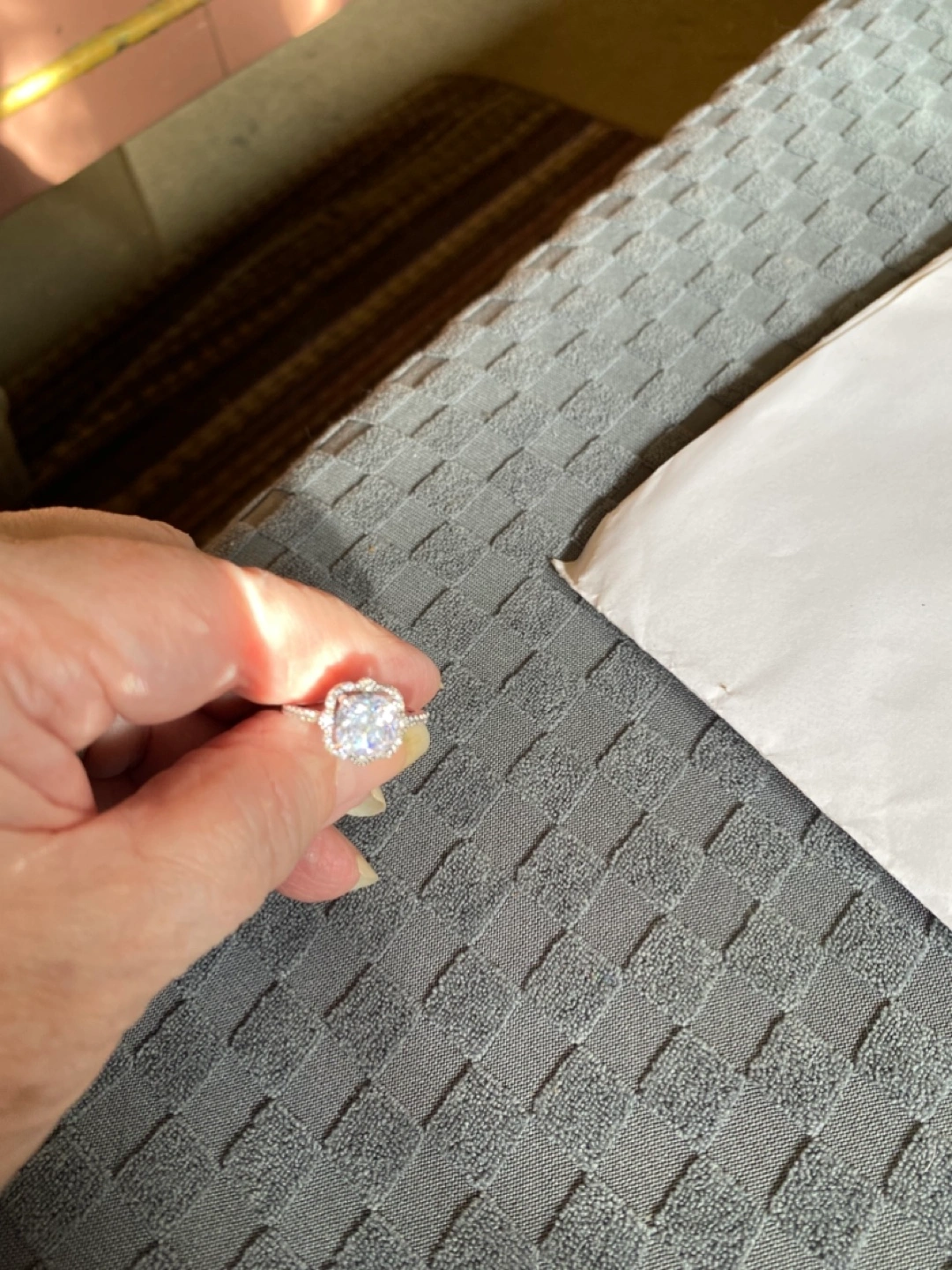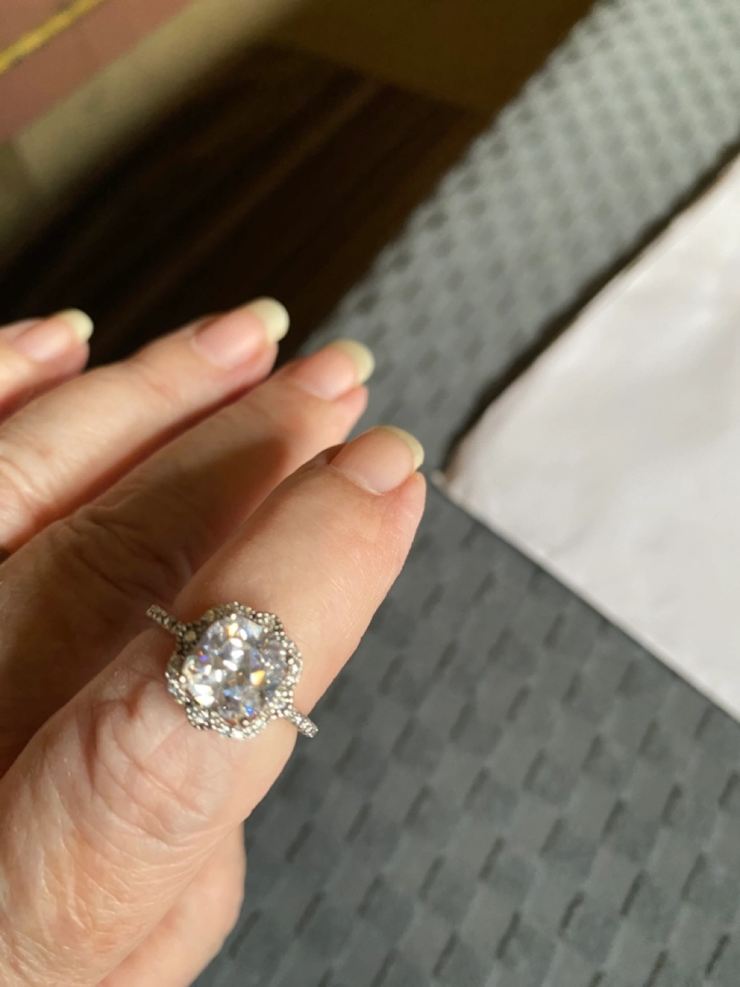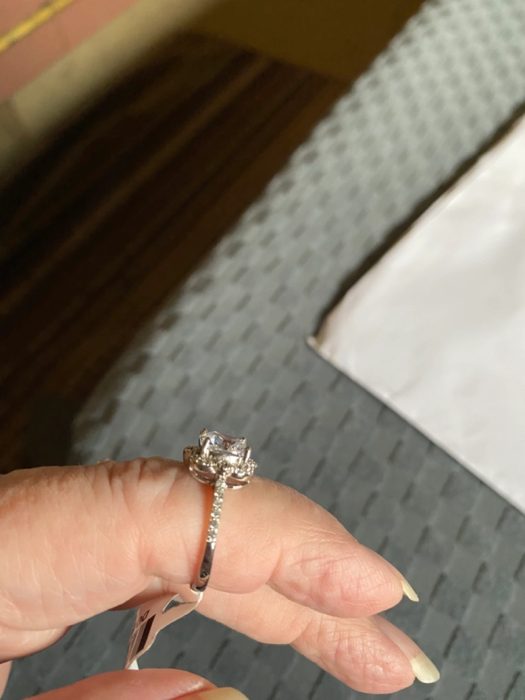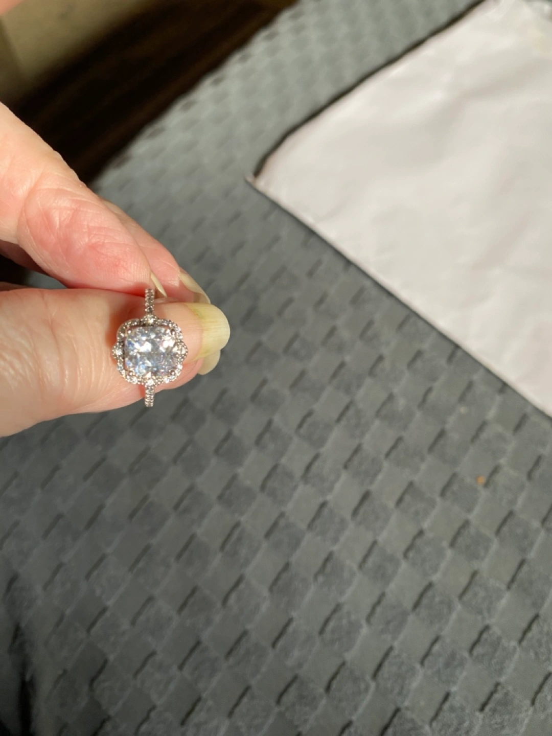 Silver ring with a large cubic zirconia stone and smaller stones surrounding it. Comes with a box. Size 7, sterling silver Livingstone Avenue Toronto