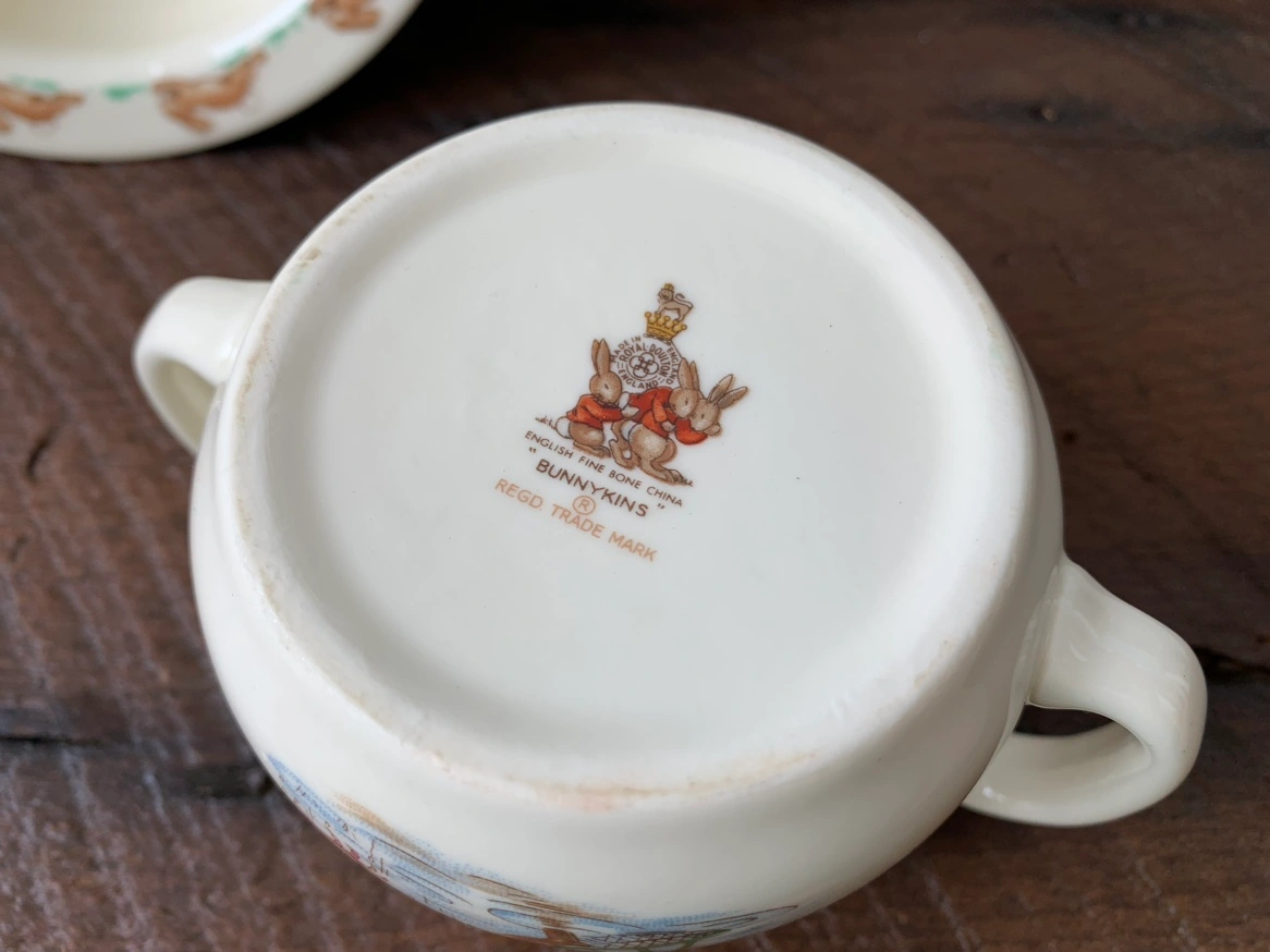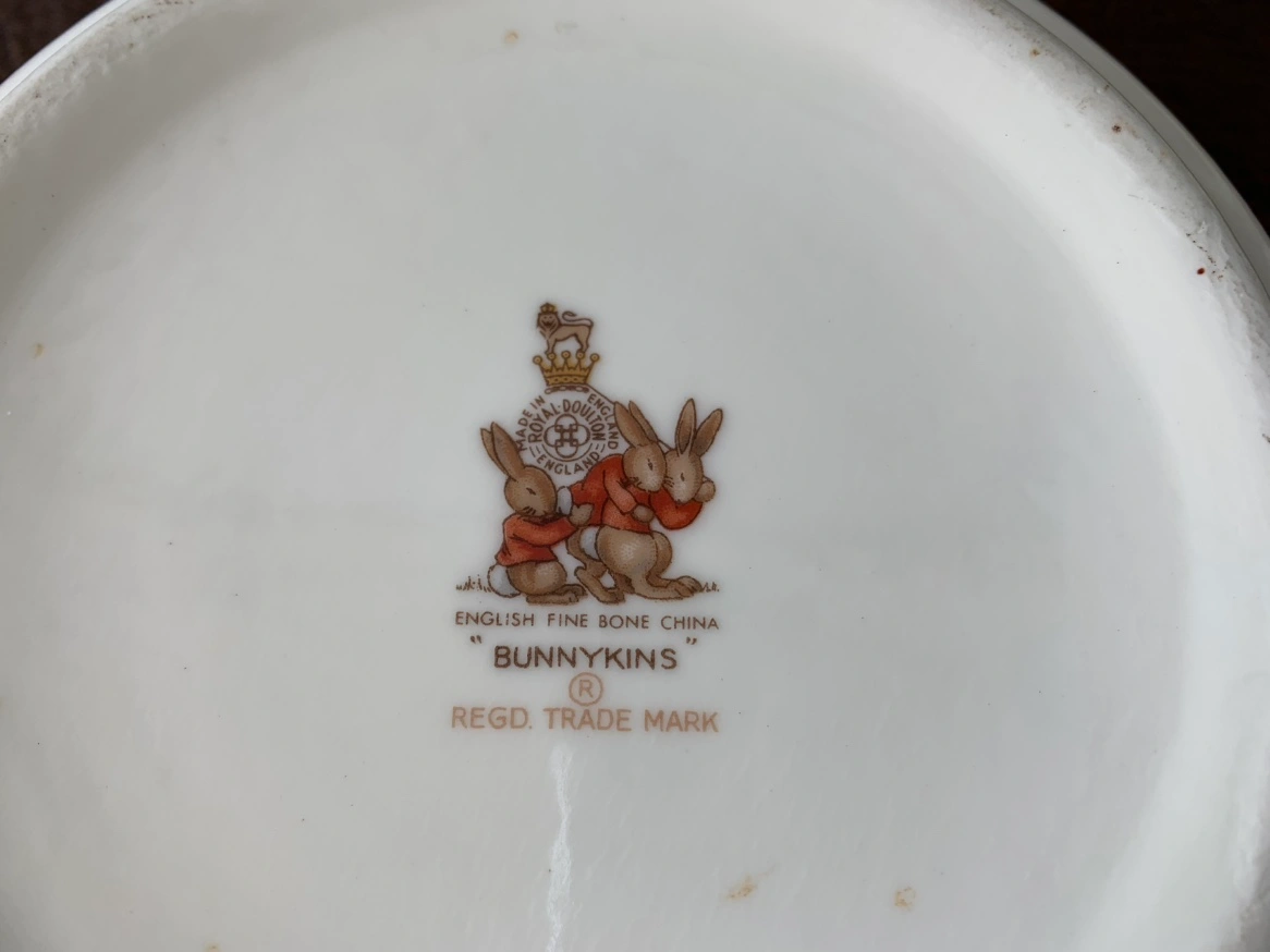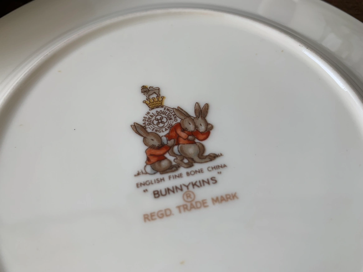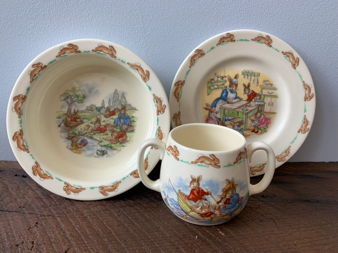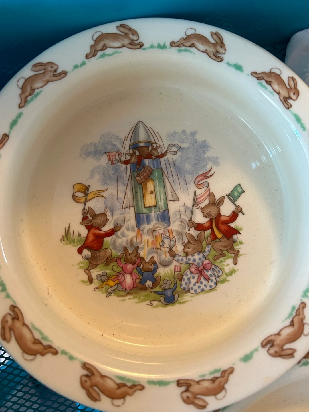 Vintage Royal Doulton Bunnykins first dish set. Made in England. 2 piece set cereal bowl & mug “picnic by the river” scene. Bonus plate features “baking day” scene. Bonus bowl features “rocket launch” scene.