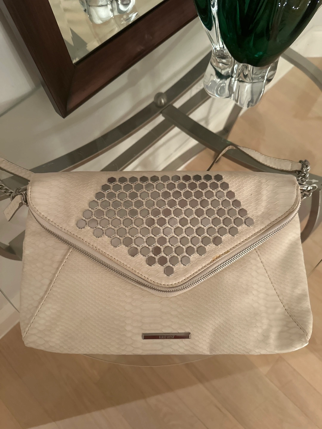White clutch with silver accents. Has a chain strap and a zipper closure.