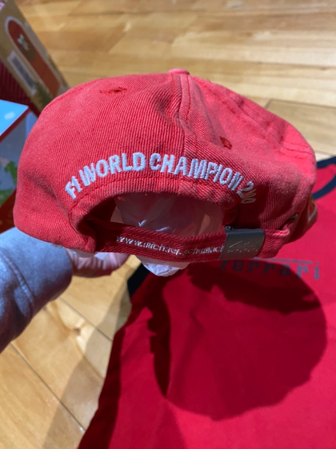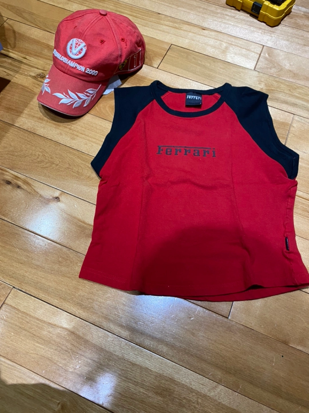 Red Ferrari cap and sleeveless shirt. The cap features the Ferrari logo and 'F1 World Champion 2000' embroidered on it. The shirt has a black collar and sleeves and a Ferrari logo on the front.