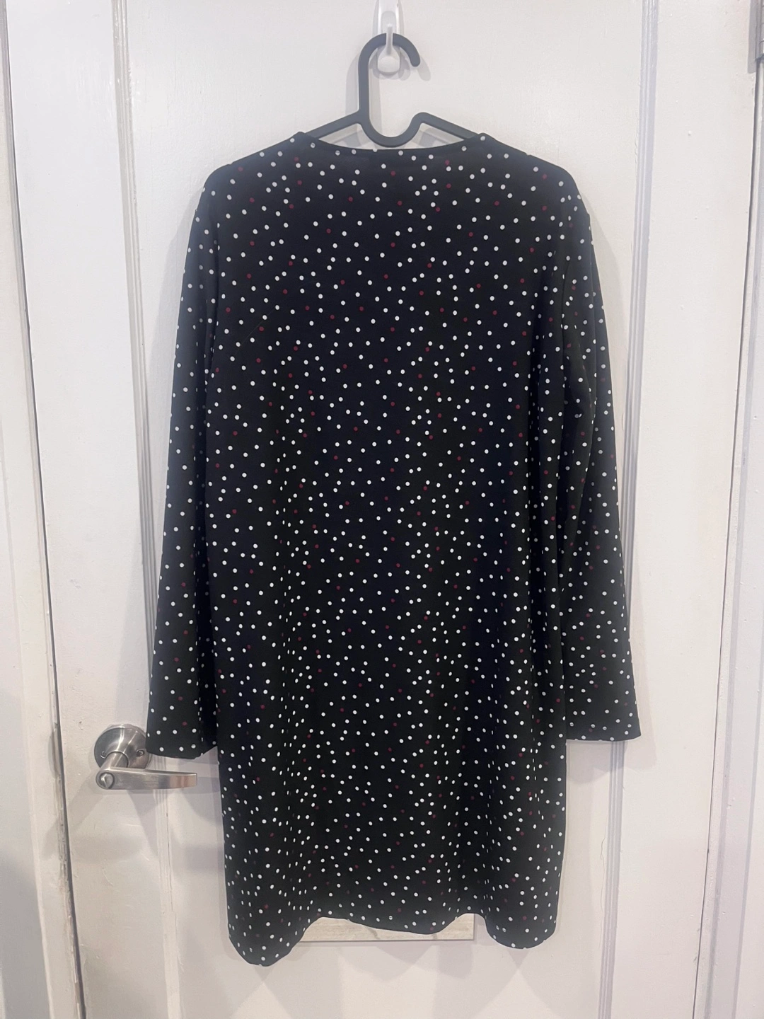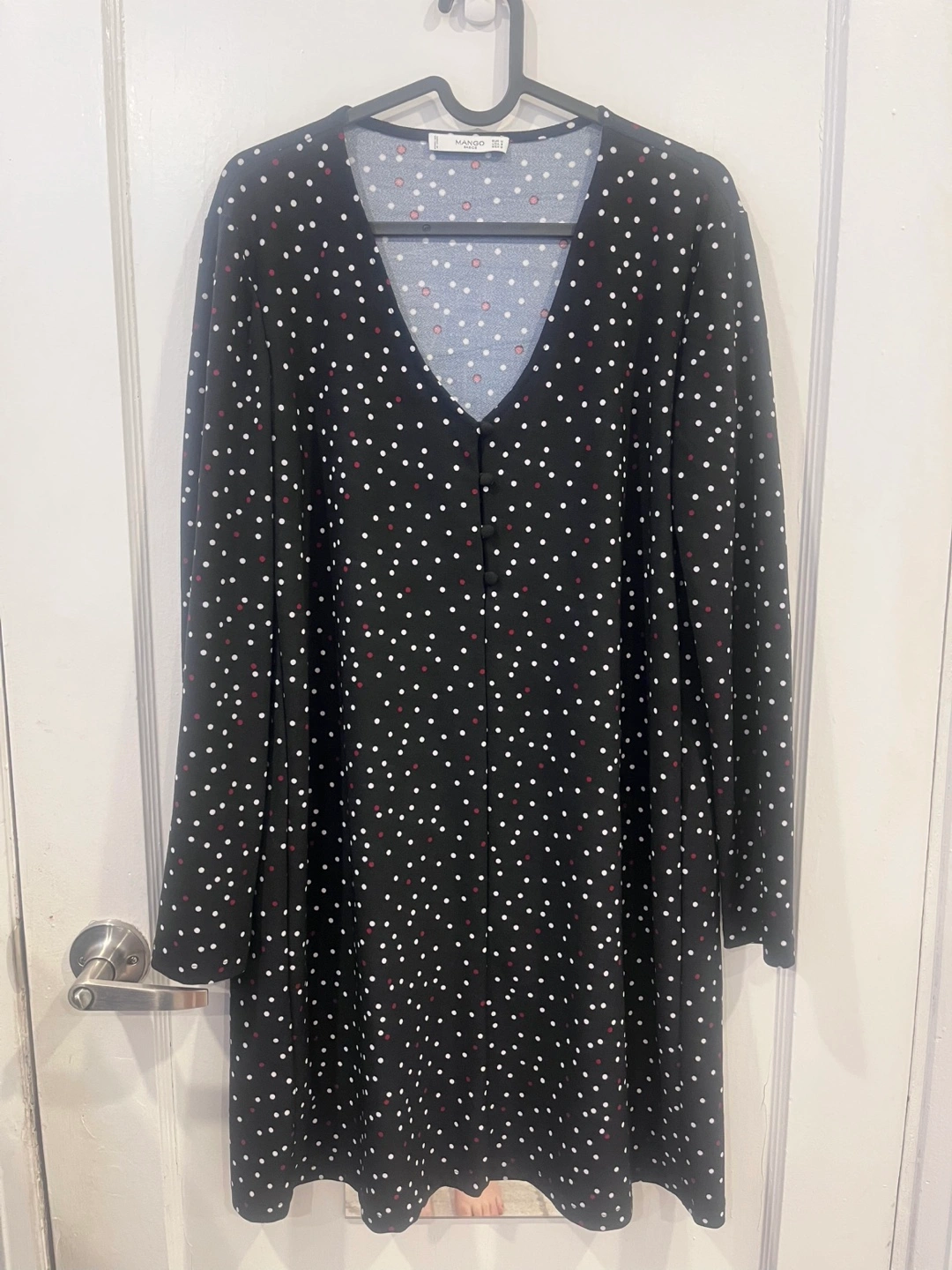 Black polka dot dress with long sleeves and a V-neck. Button closure at the front.