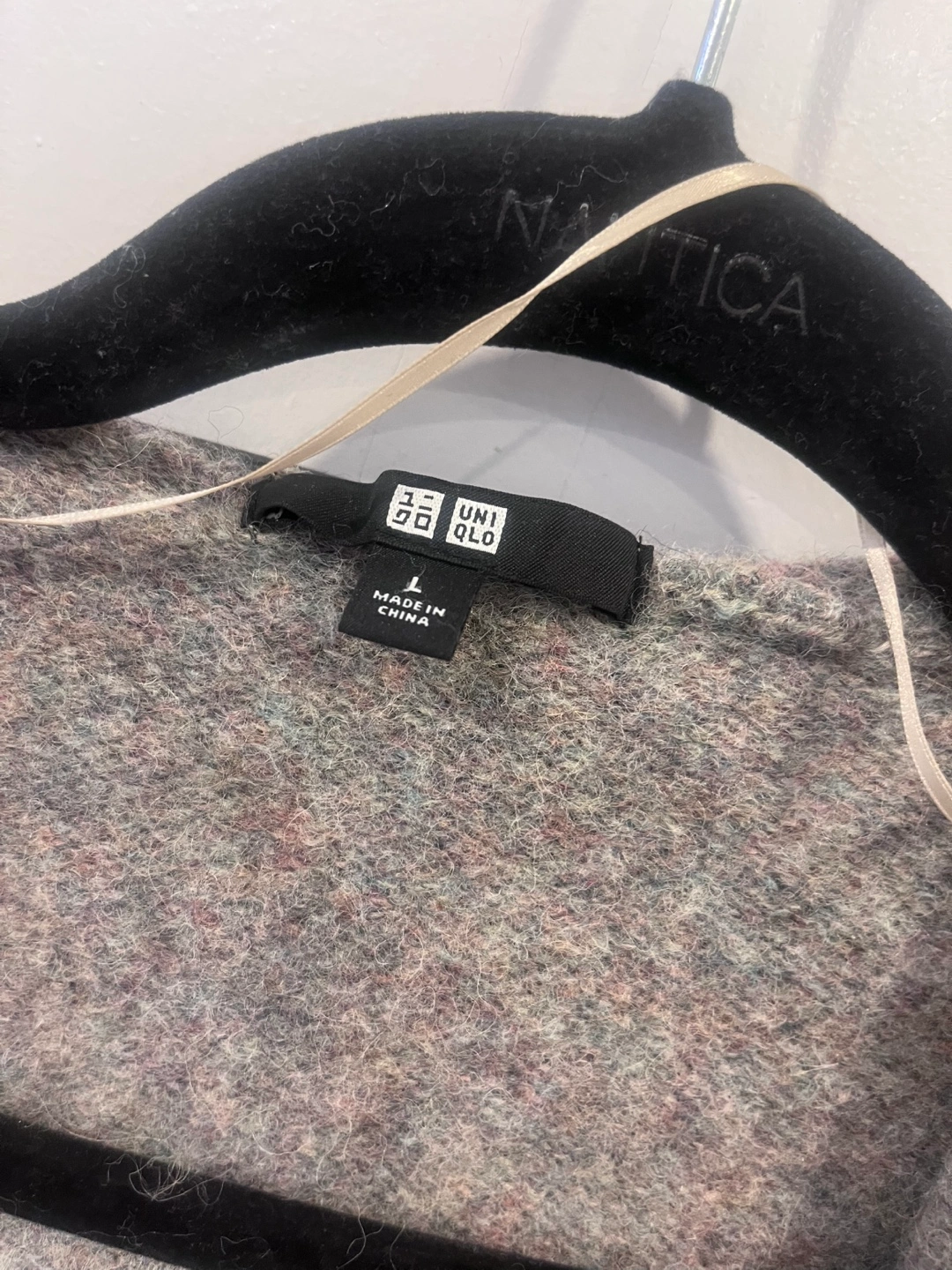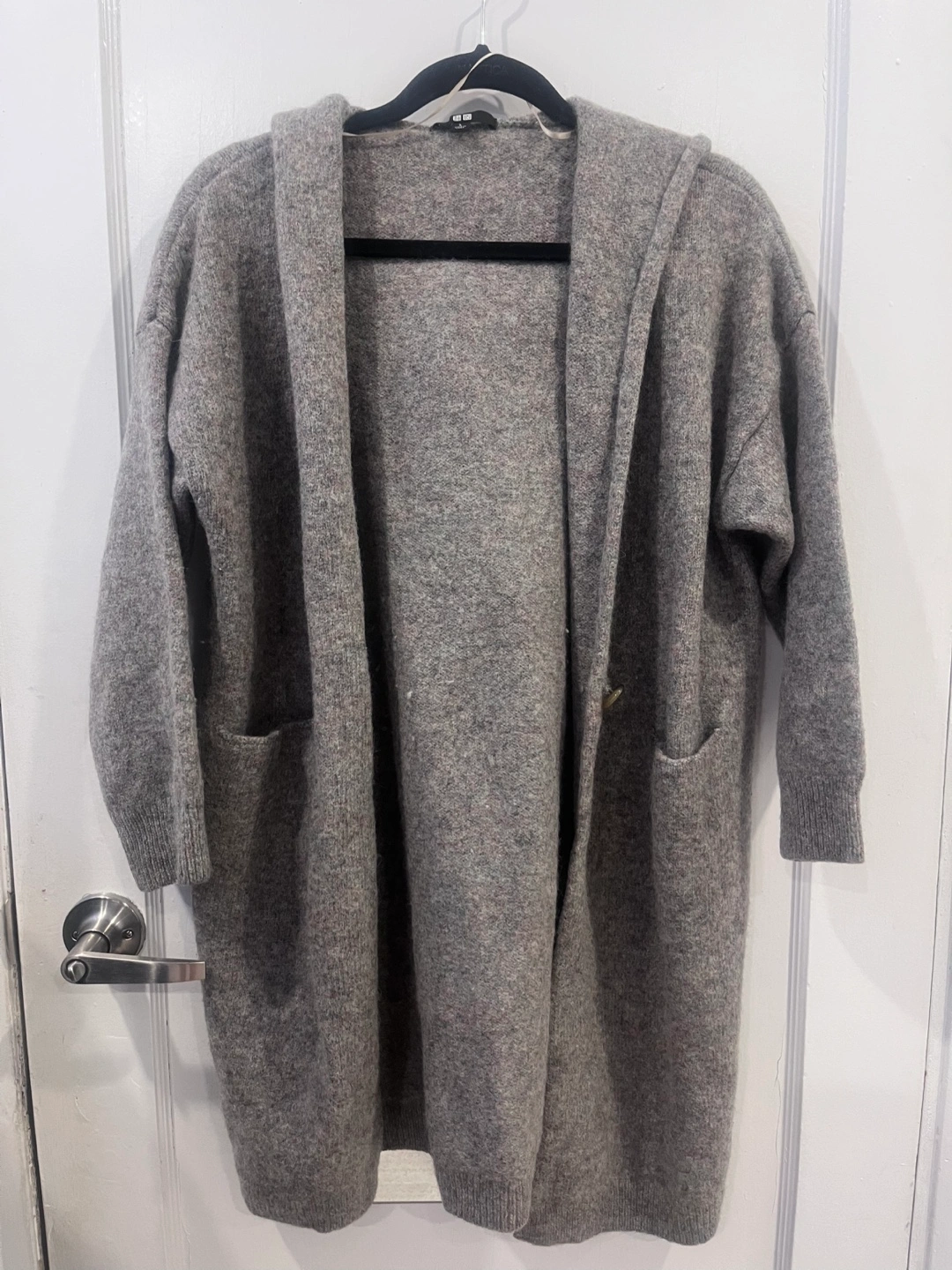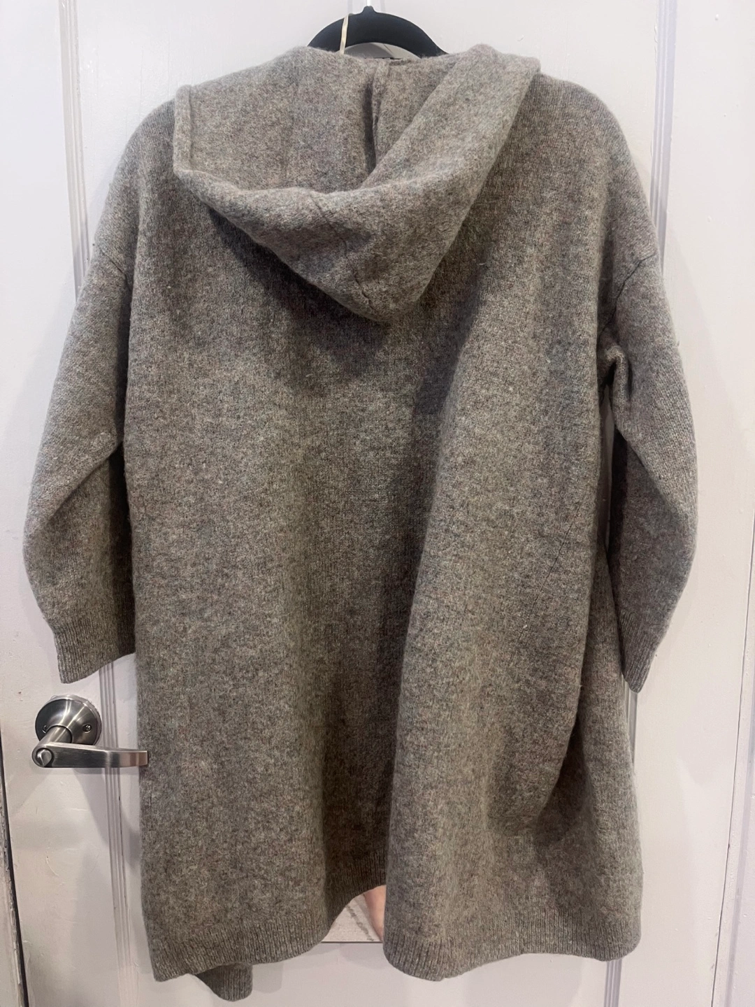Grey hooded 100% wool cardigan. Long sleeves, pockets, and a button closure.