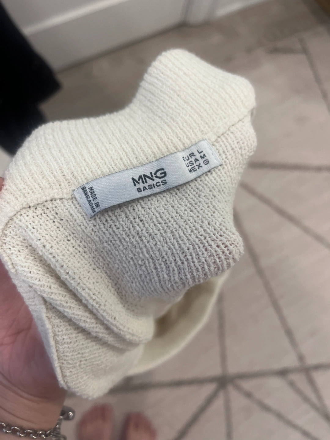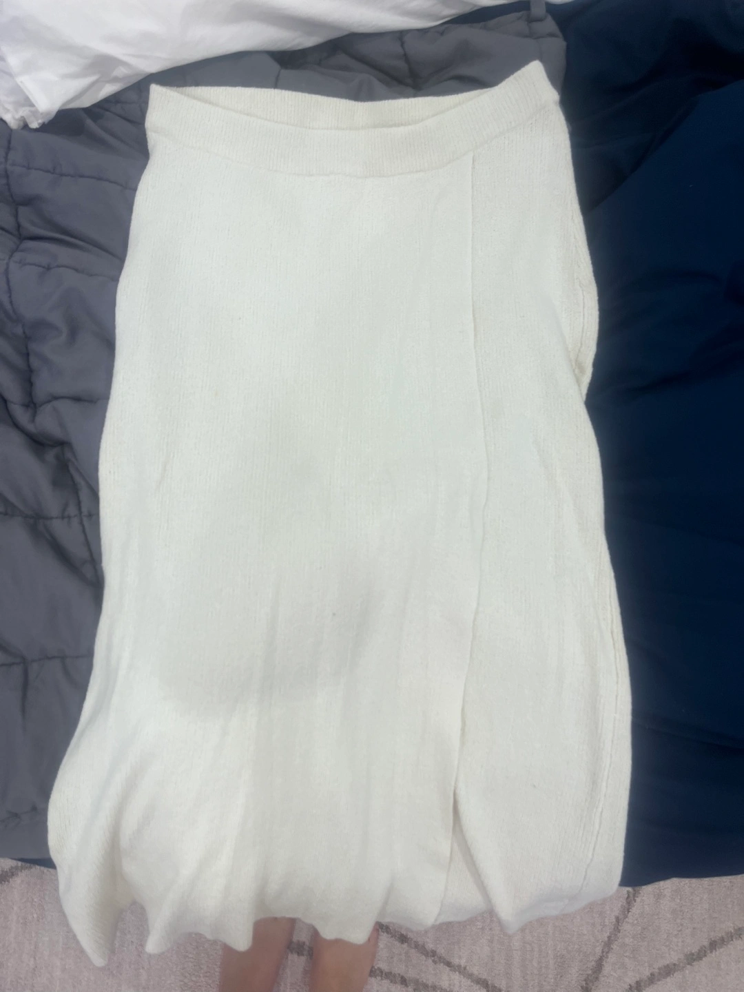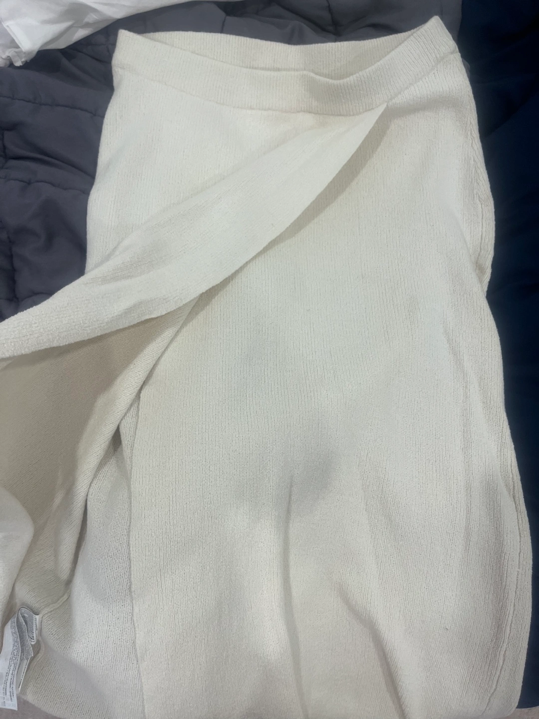 White knit skirt with a tie at the waist. Midi length. Made in Bangladesh.
