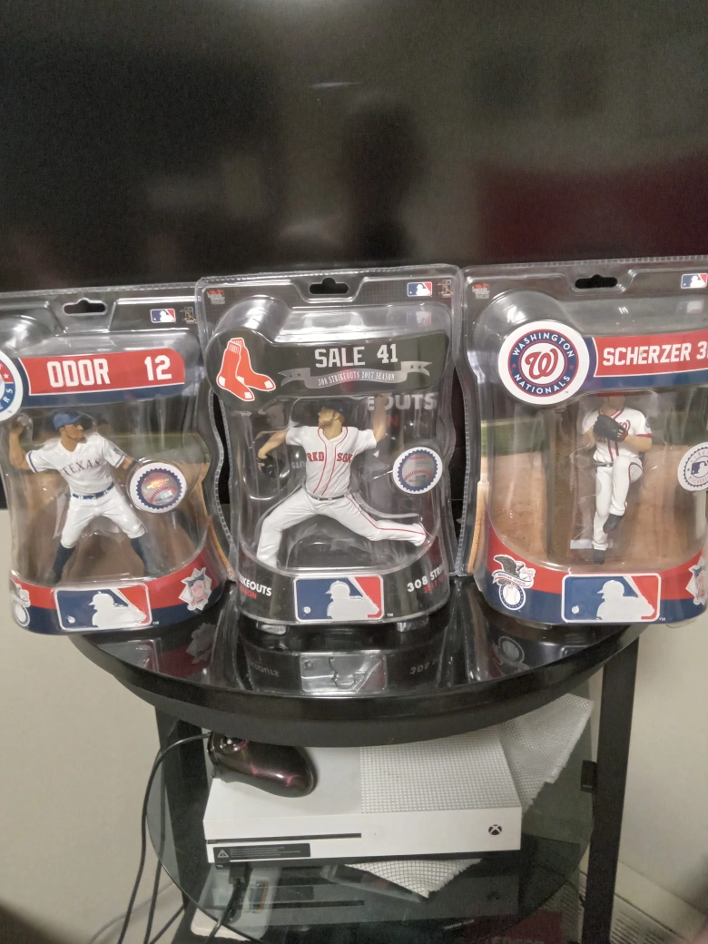 Set of 3 MLB baseball player figurines, all in packaging. Includes Odor, Sale, and Scherzer.