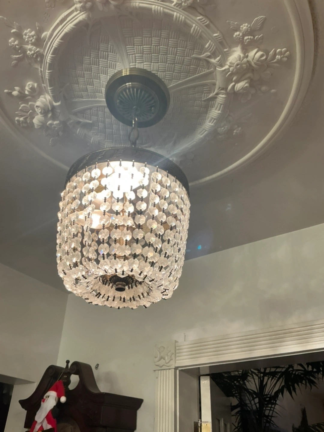 Hanging ceiling chandelier, has multiple tiers of small crystals, brass colour metal frame. Light fixture is in excellent working condition.