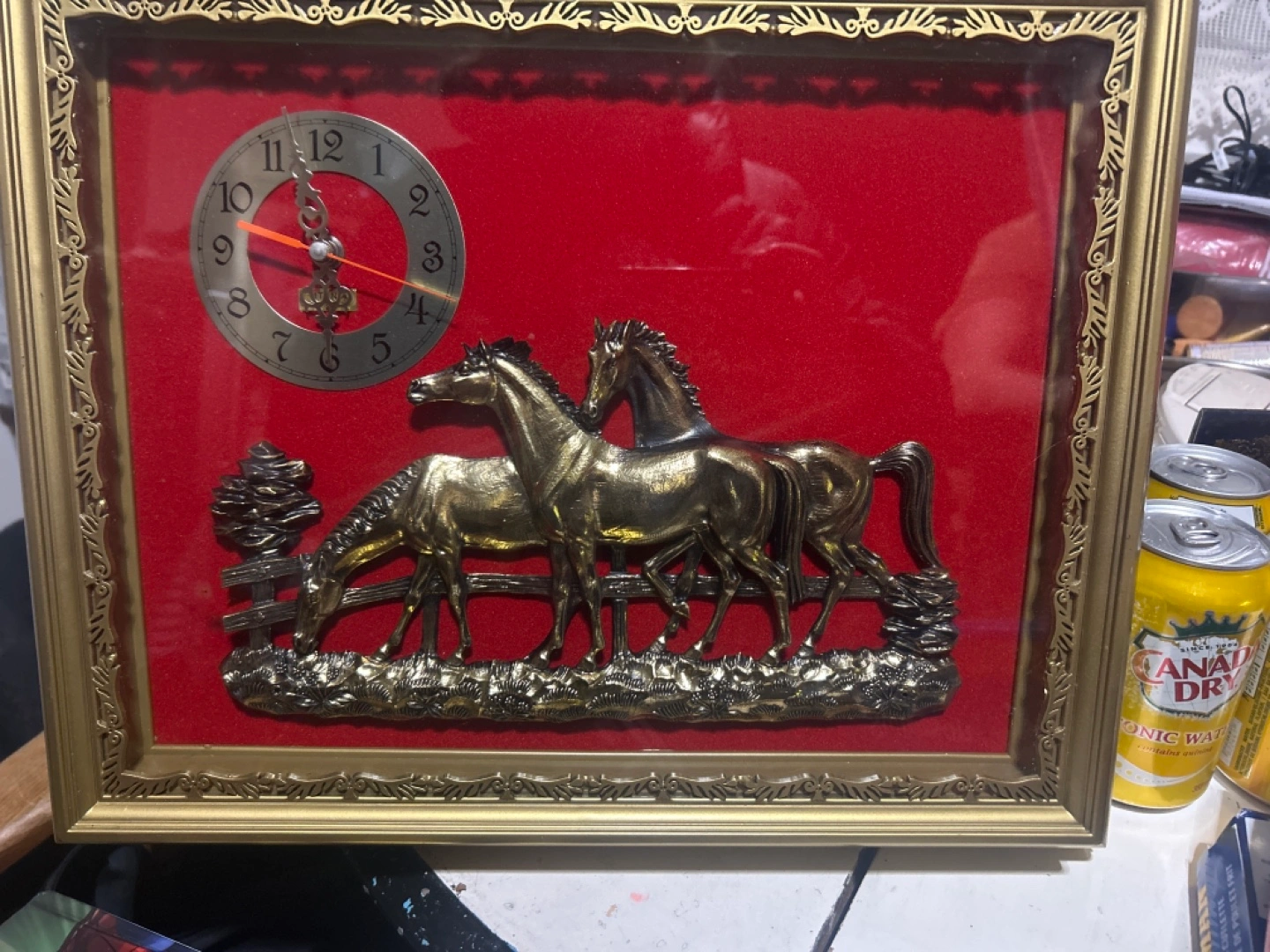Antique Clock framed in gold, featuring three horses in a field. Red background with gold details.