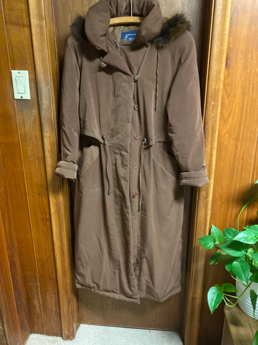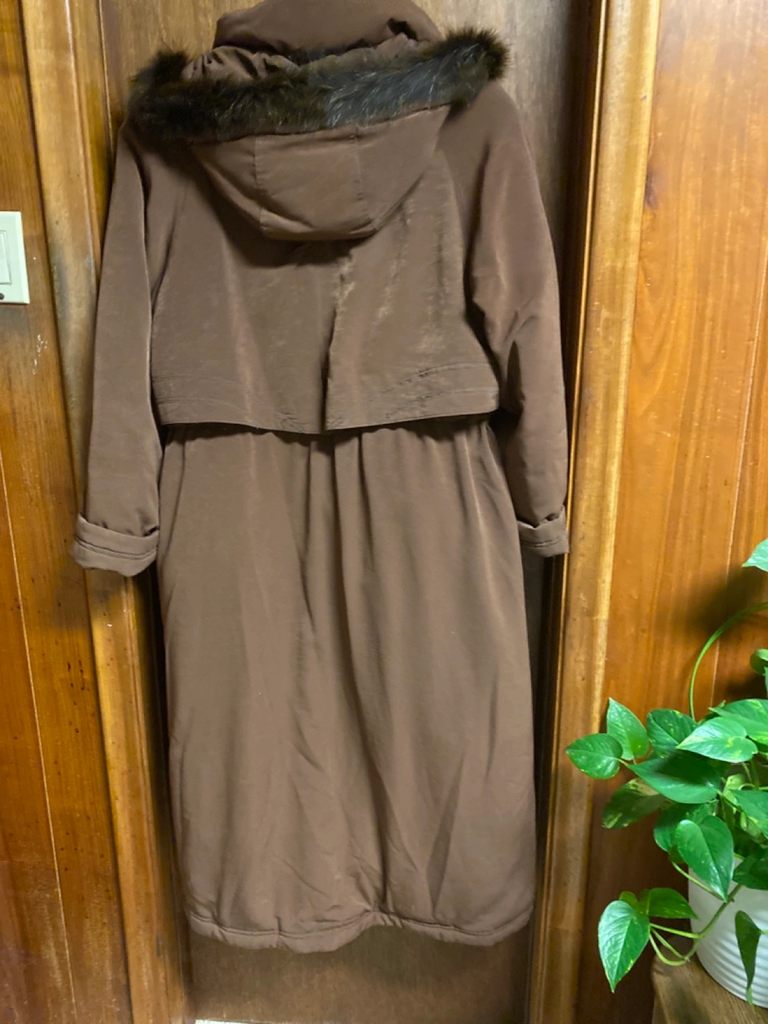 Long brown winter coat with faux fur hood. Has a zipper and button closure. Drawstring at the waist. Size Small. Very warm, pick up near steeles and Bathurst