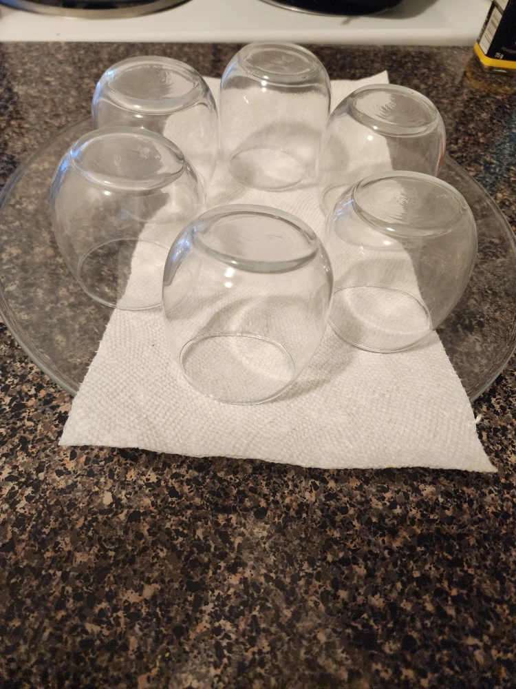 6 mini glass cups with glass plate to serve. Can be used for serving. This item was never used but got rid of box as it was taking up too much space in the storage. Brand new
