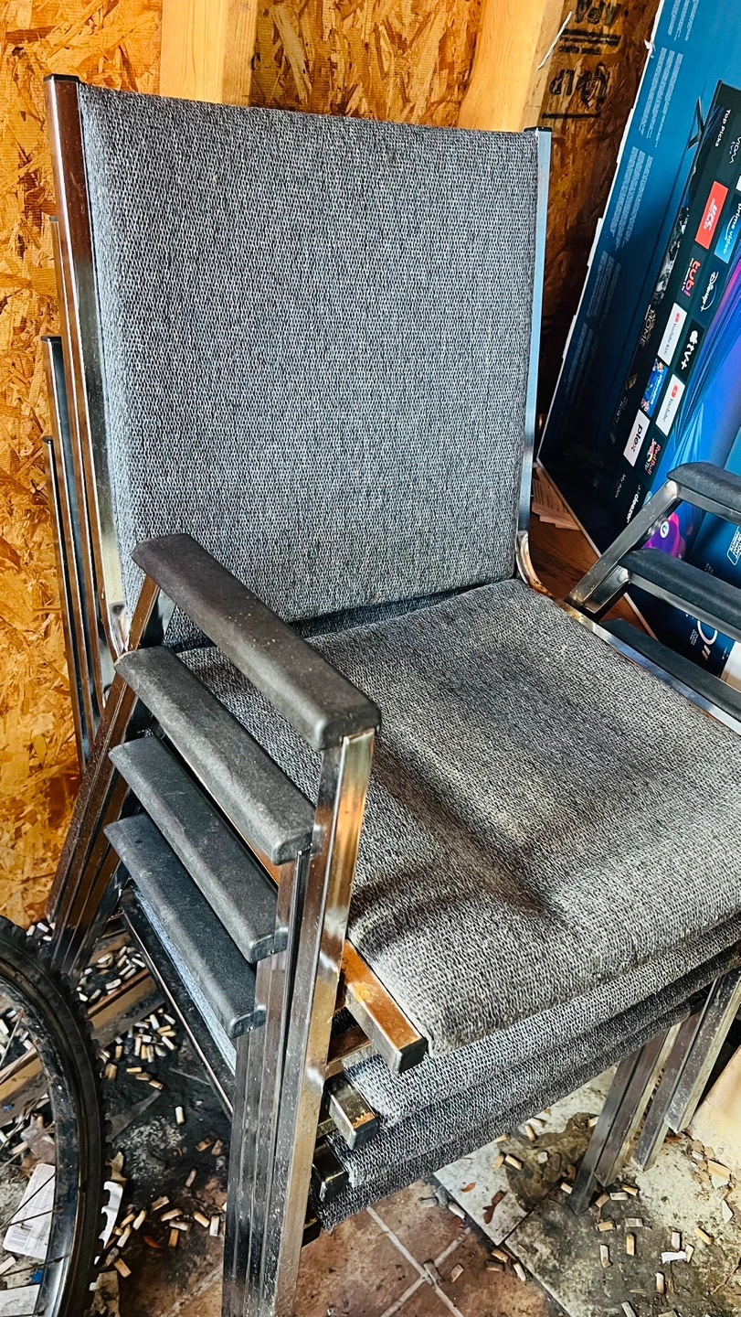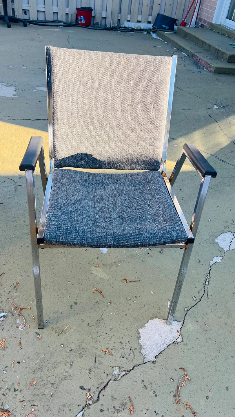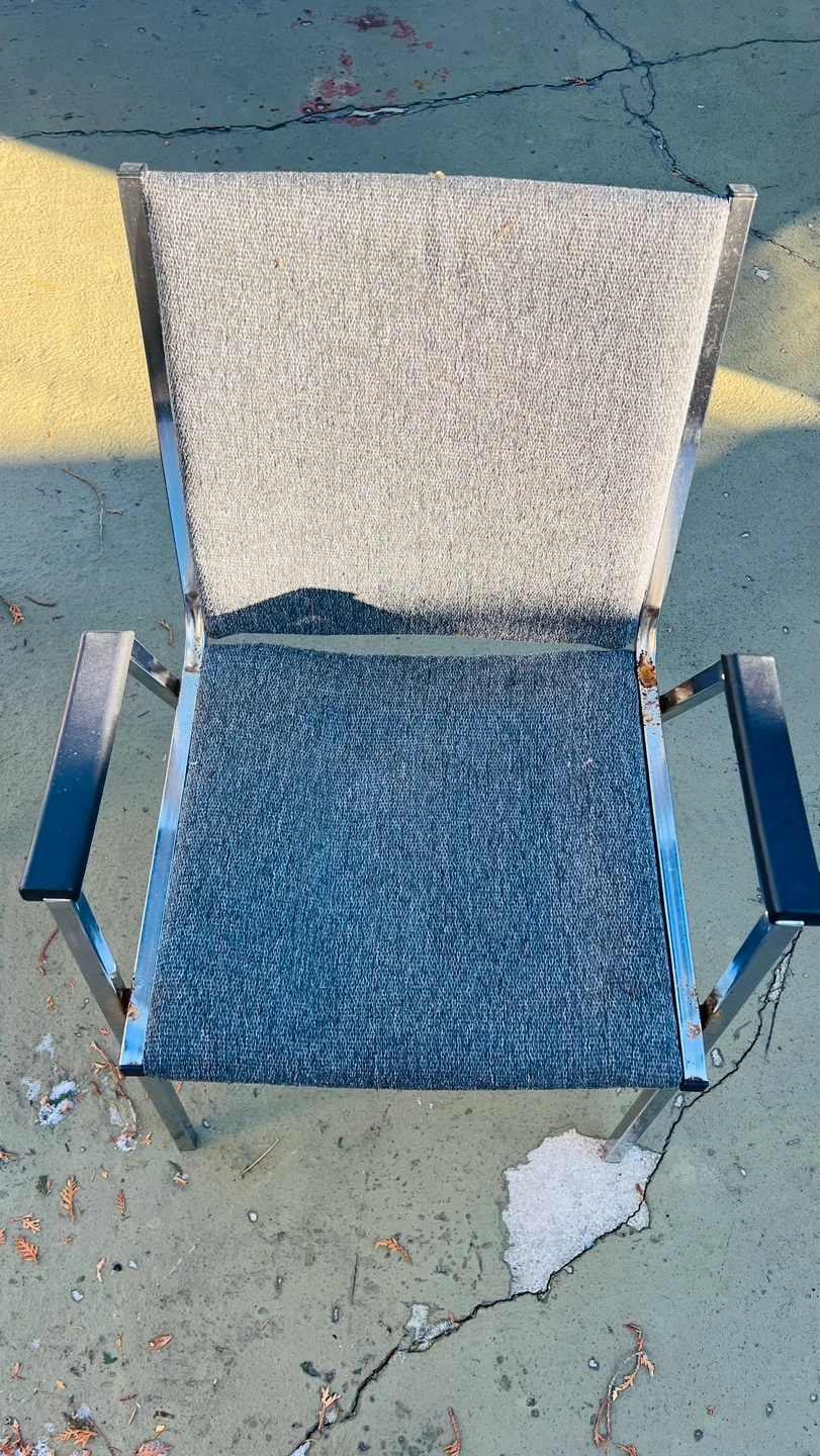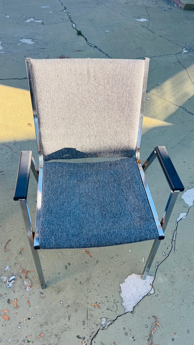 Set of 4 chairs with chrome frames and grey fabric seats. The chairs are in used condition and have some wear and tear. The arms are black plastic. Little rust on the side on some chairs but nothing to worry. All for $30. Set of 4. Or if you want single chair only than $10 each or $30 for all deal. Can be used in your backyard or any other personal uses.