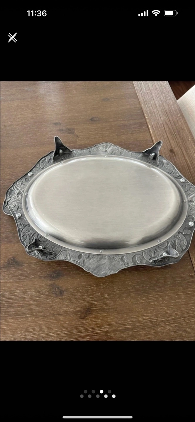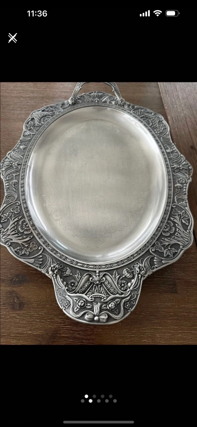 Ornate silver serving tray with two handles and four feet. Features an embossed design on the edges and bottom.