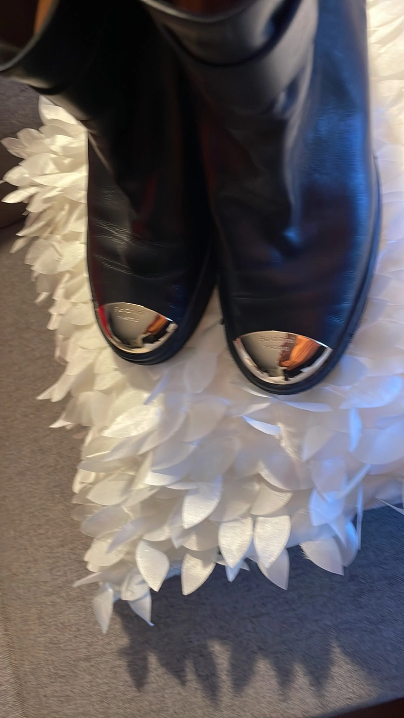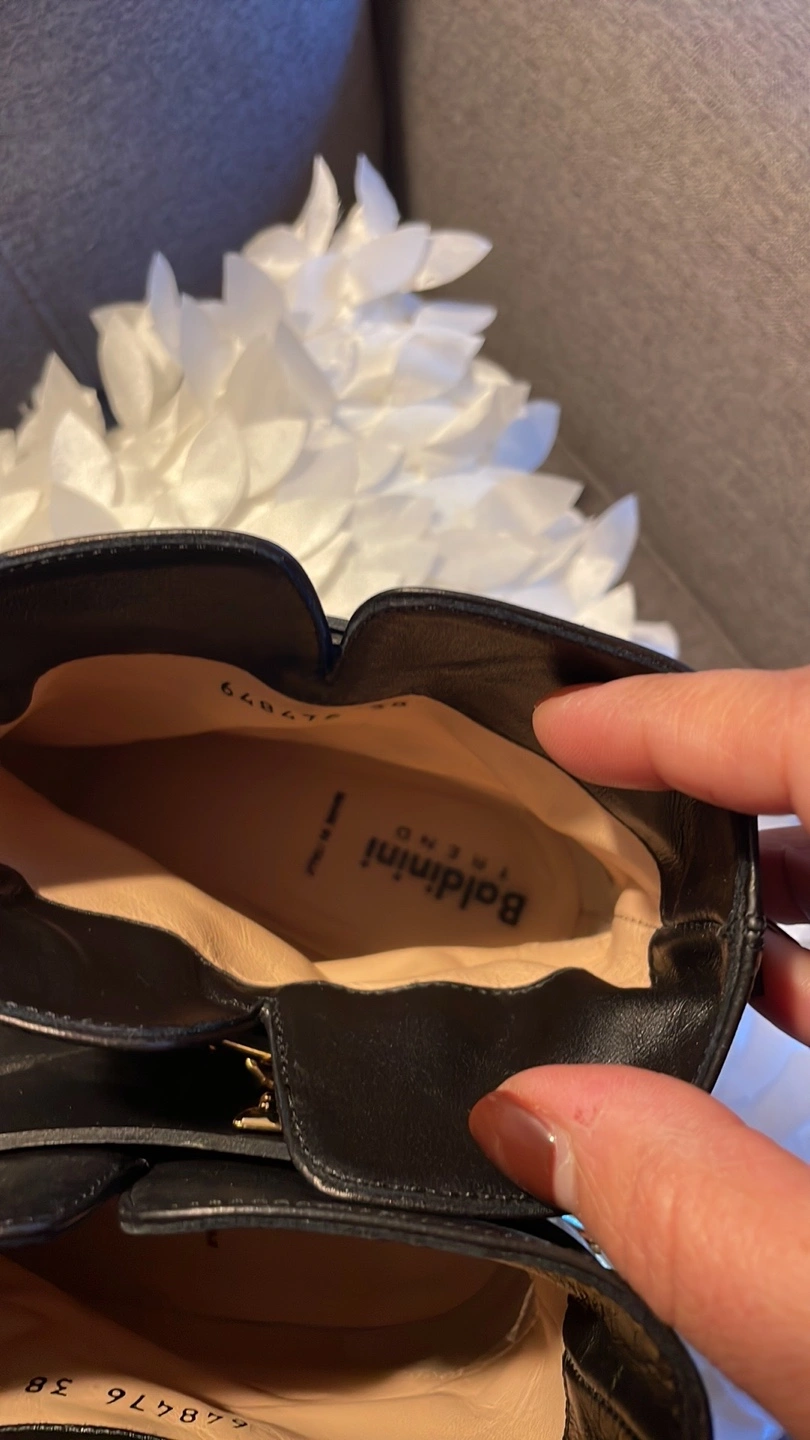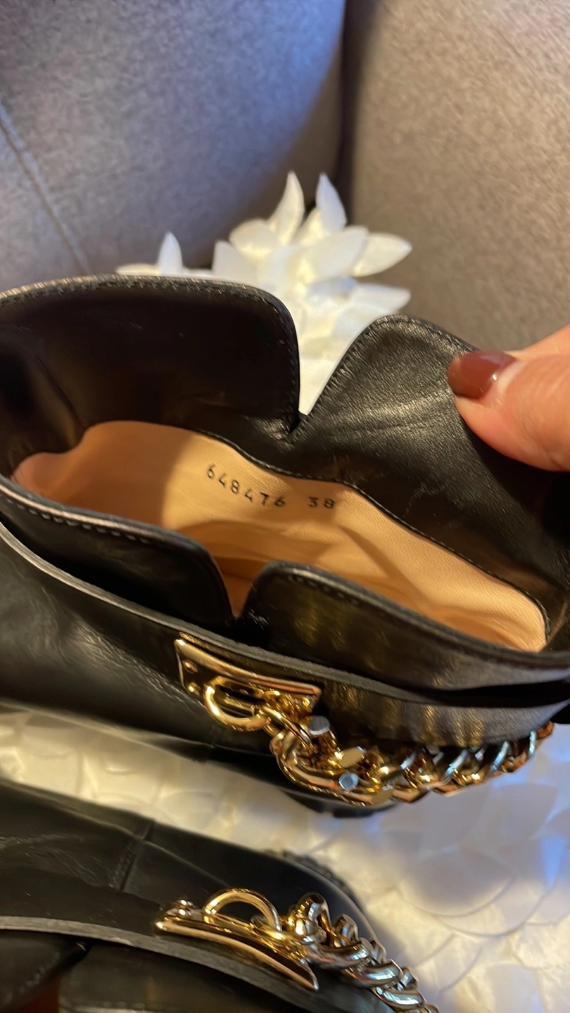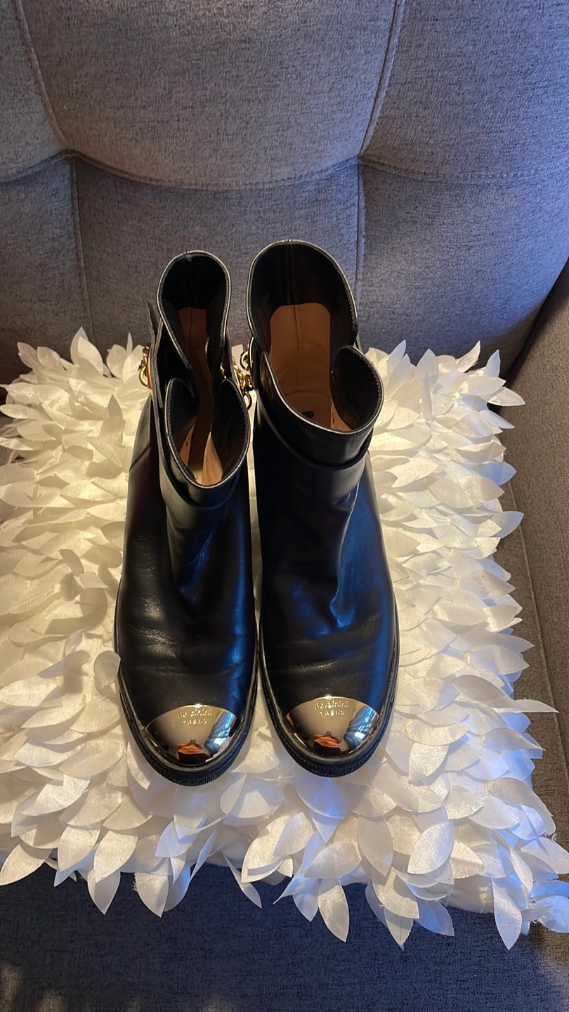 Black leather ankle boots with gold chain detail. Gold toe caps.