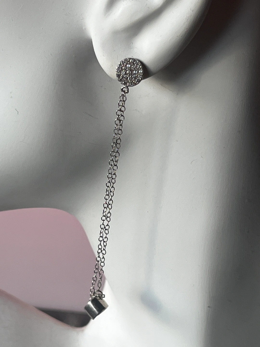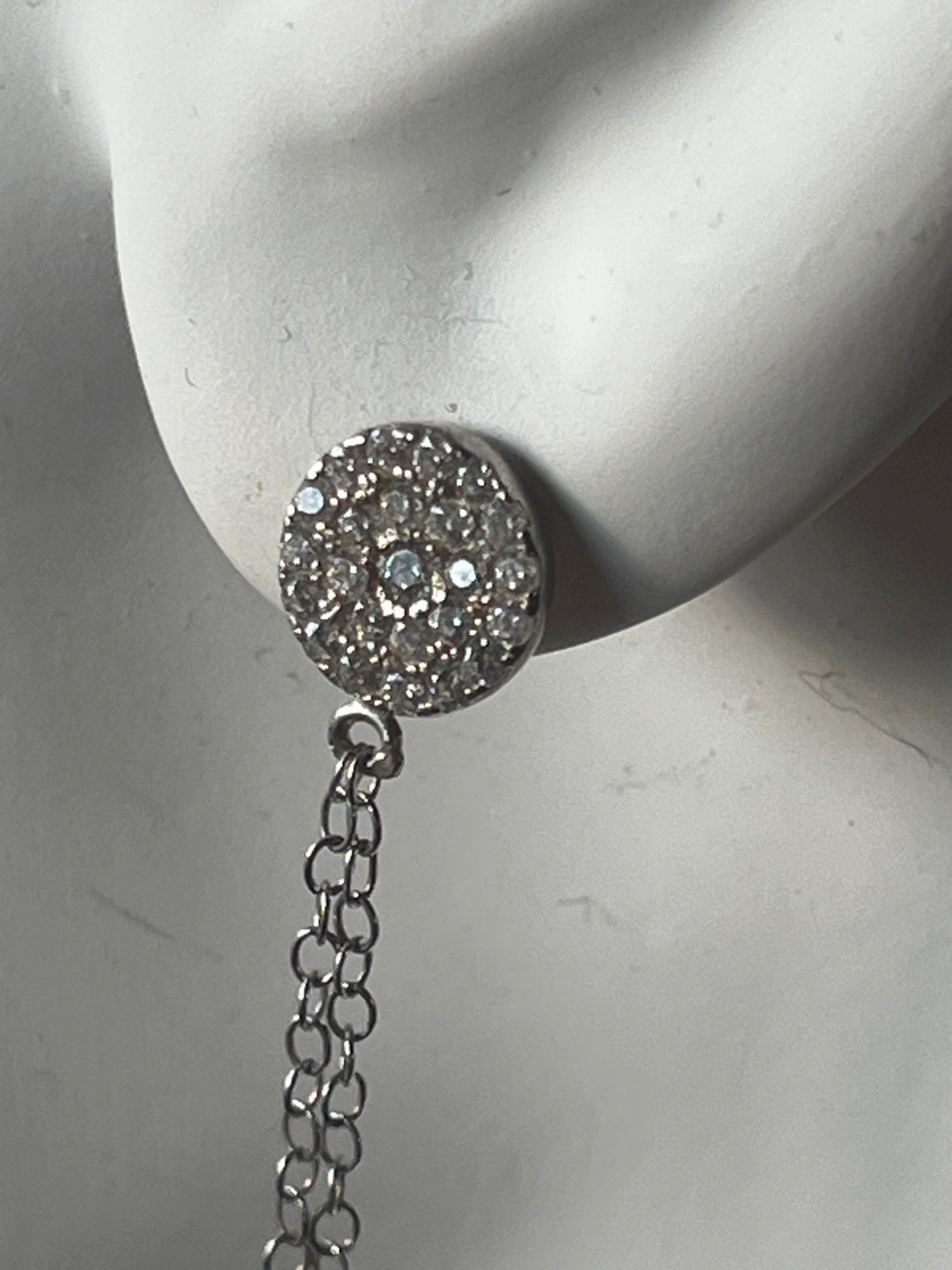 Silver dangle earrings with round pave setting. Each earring features a round pave setting and a long chain. You can pick up by Carlton and Jarvis area