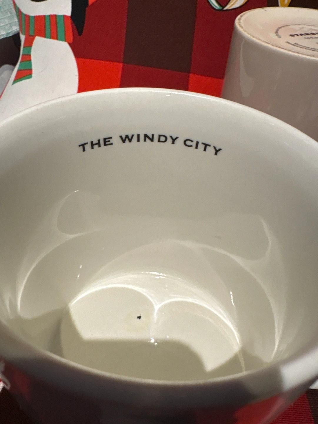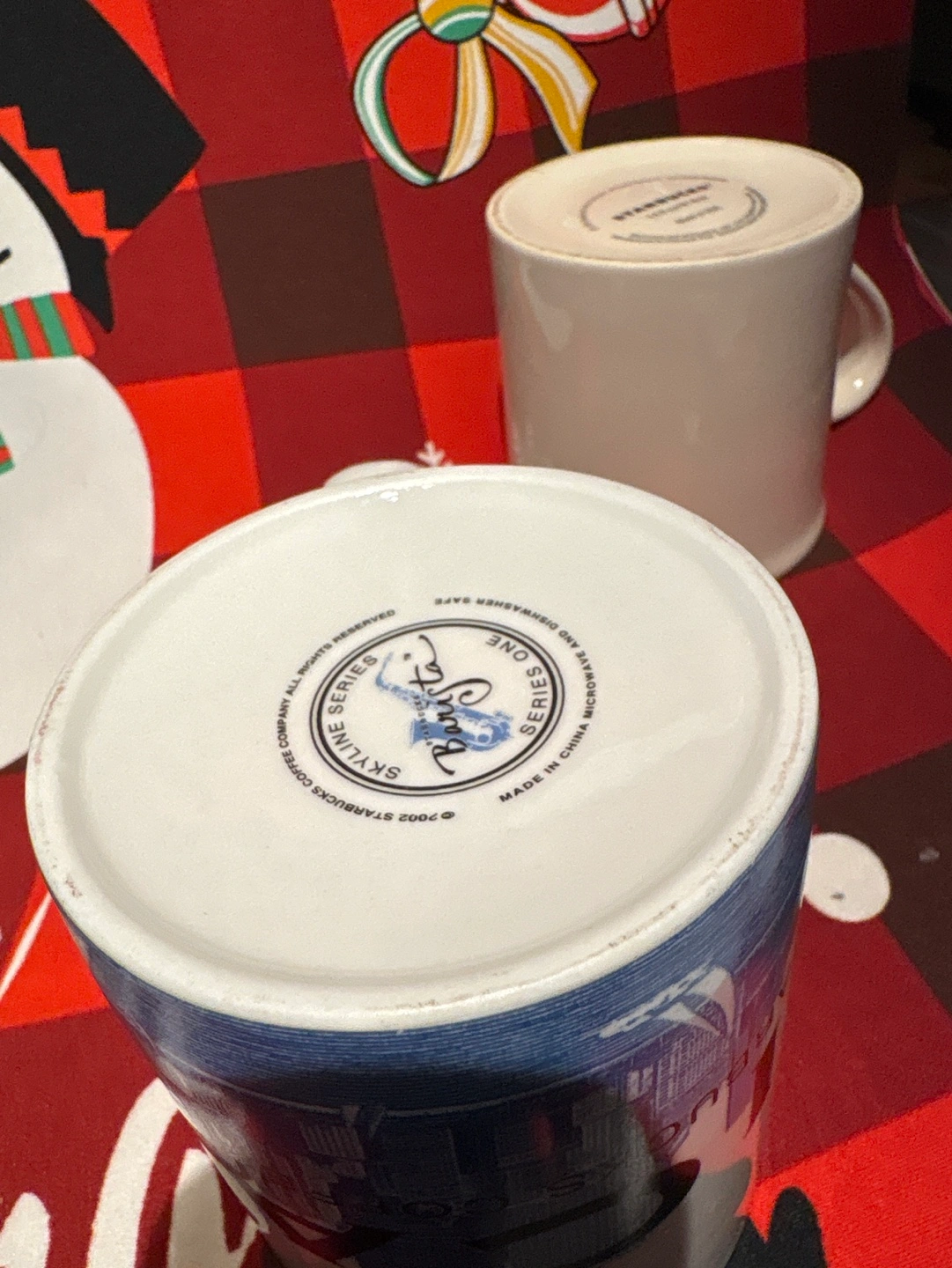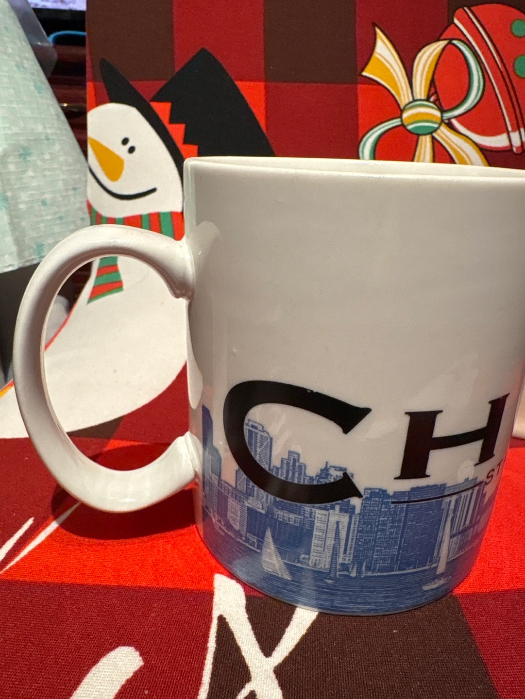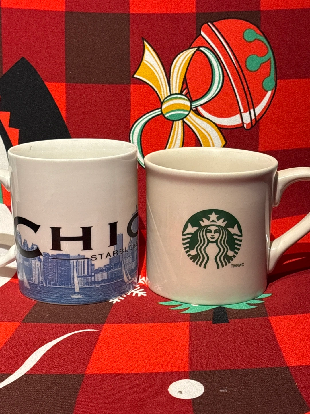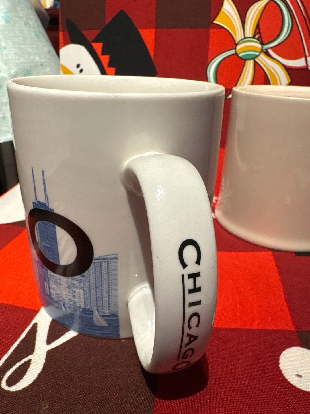 Starbucks mug with a blue and white cityscape of Chicago. 14 oz/414 ml. 15$ each or both for 25$