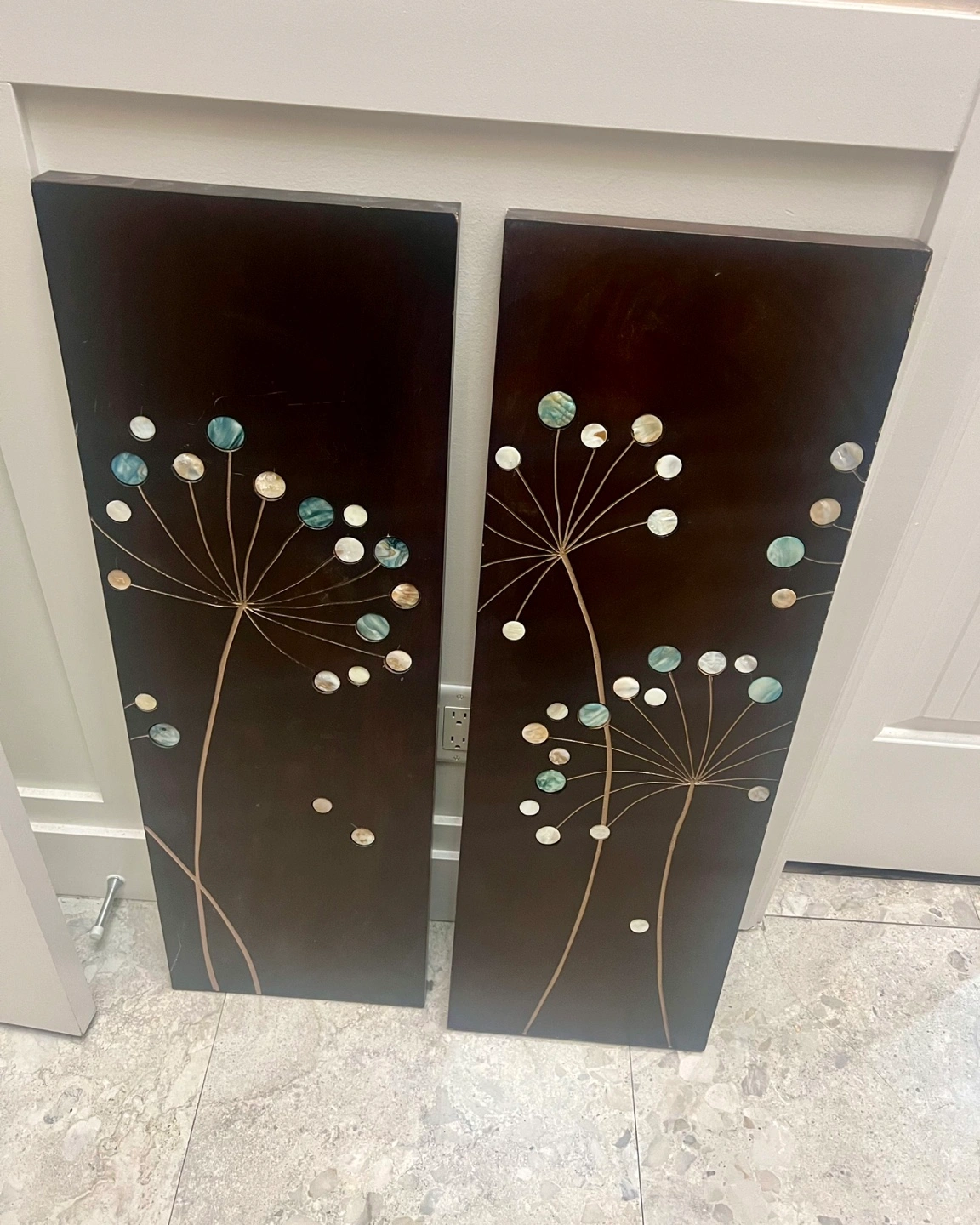 Set of 2 wall art panels, dark brown background with a flower design with iridescent accents.