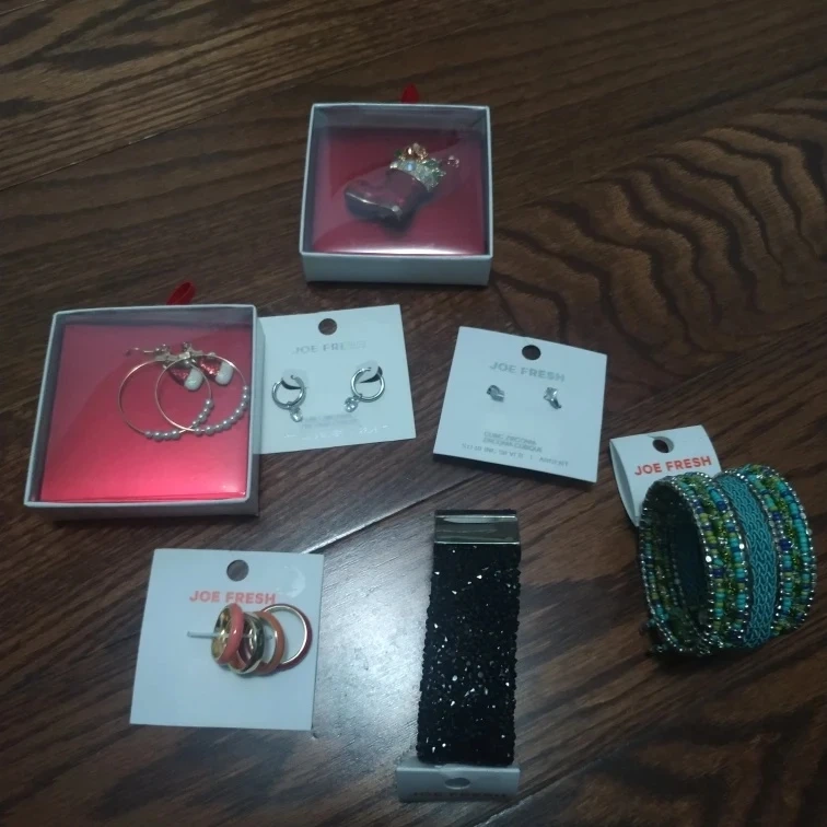 Set of Joe Fresh jewelry, includes a pair of hoop earrings, a pair of stud earrings, a set of three rings, a bracelet, and a pin. All in original packaging. $4 each or everything for $20