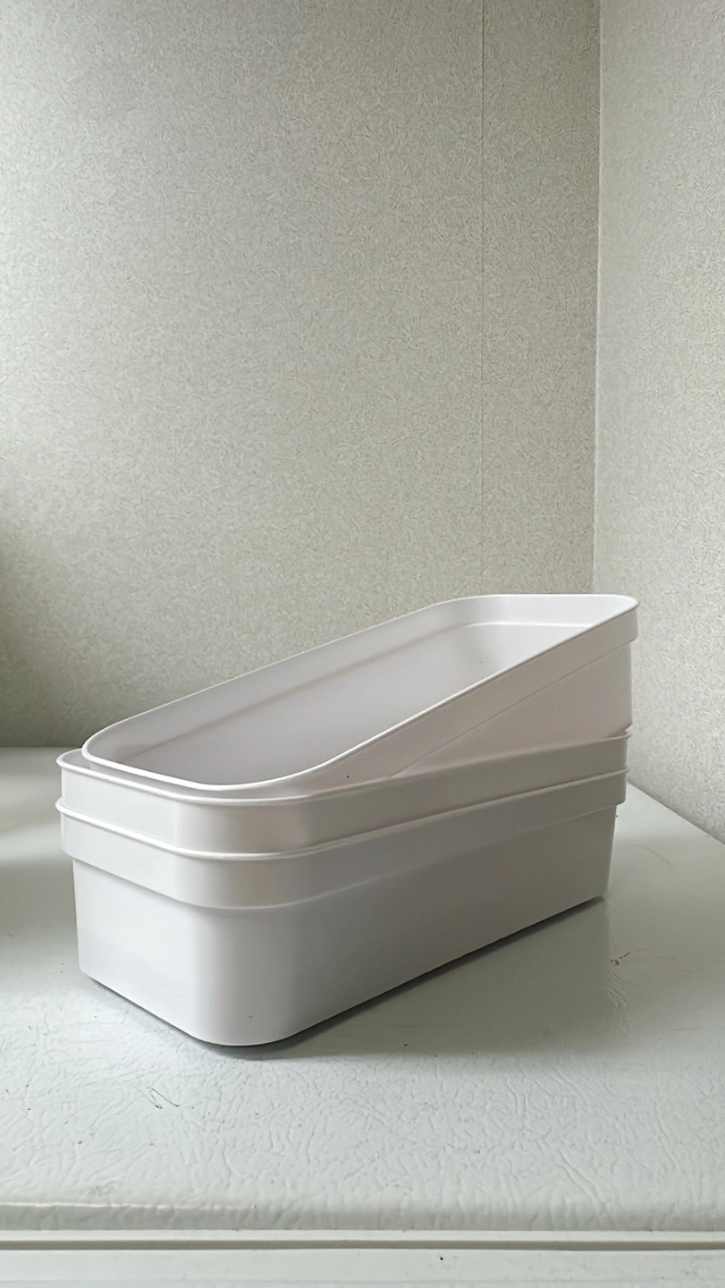 This is a set of 3 white storage organizers for from desk drawer, under sink, to cabinet shelf. They are lightweight. They have been used for 4 months but they’re still in good condition. Retail price: each $2.00 Dimensions: 10W x 23L x 5H cm