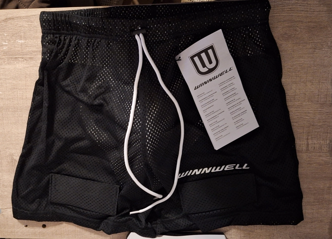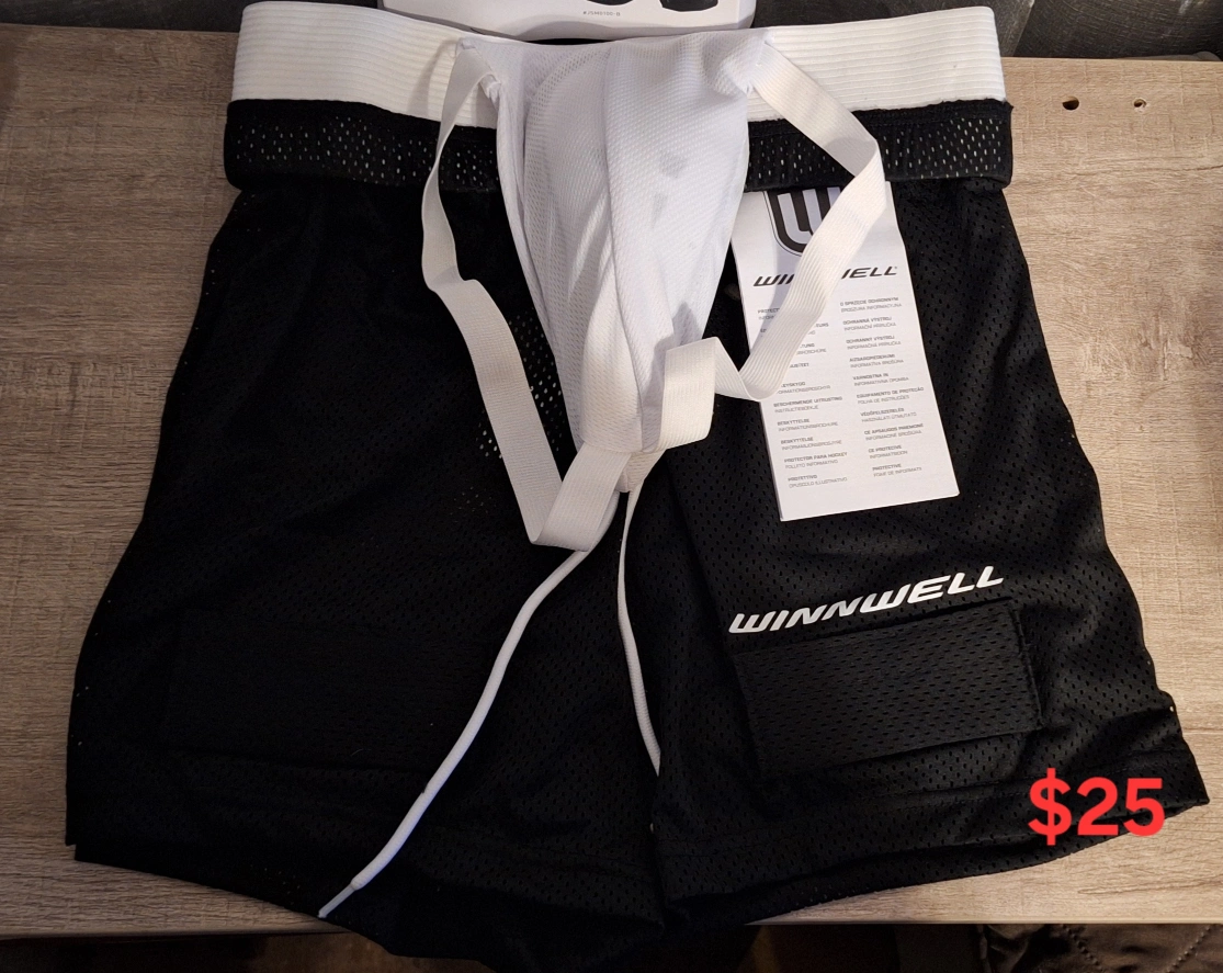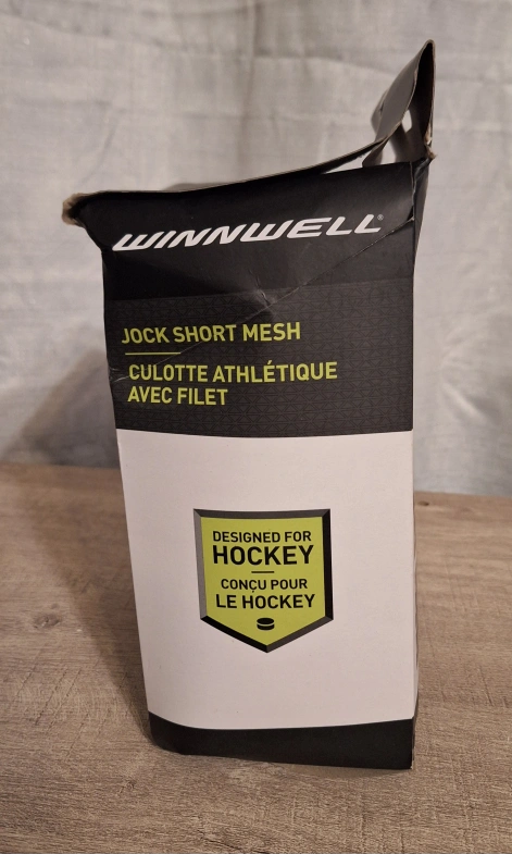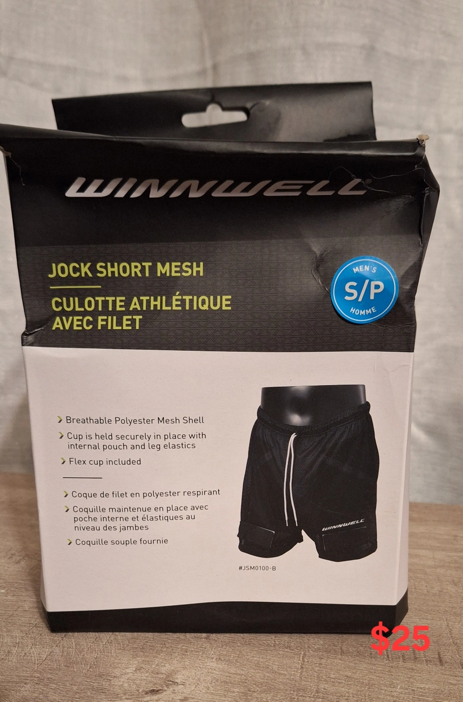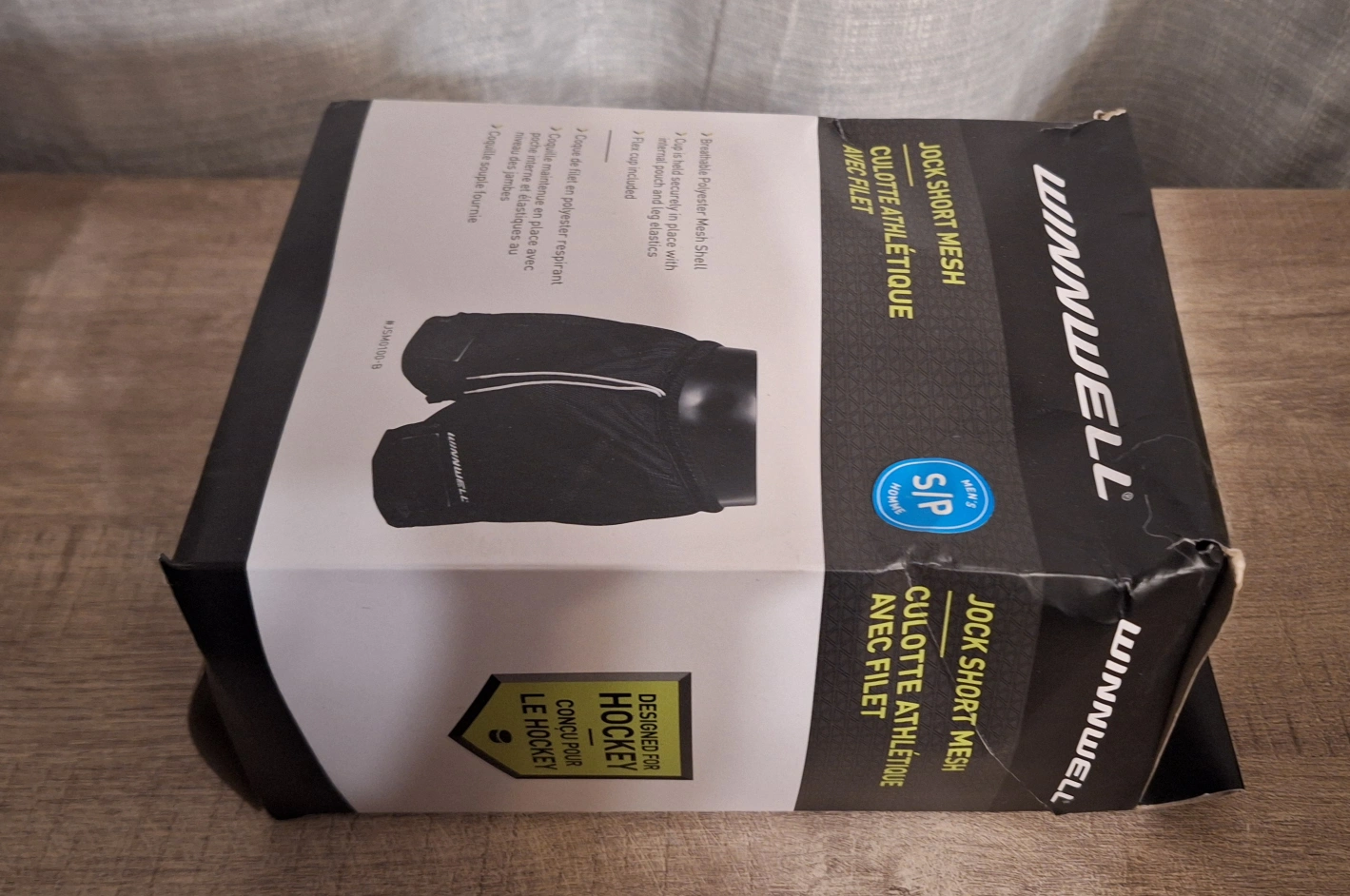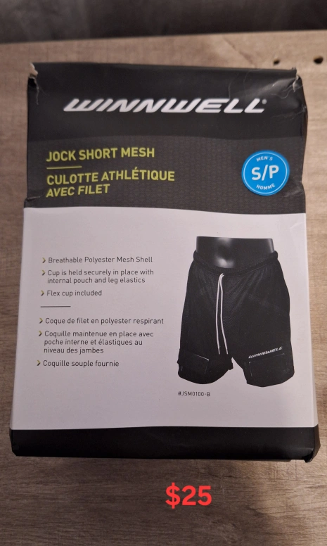 Winnwell Jock Mesh Short (Box a little damaged Breathable polyester mesh shell Cup is held securely in place with internal pouch and leg elastics Flex cup included Size available: S/P : M : XL :L Condition brand new The box is a little damaged Danforth and Eglington Pick up only