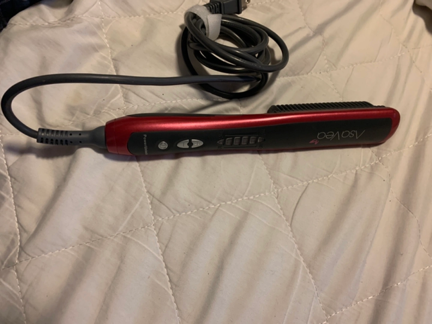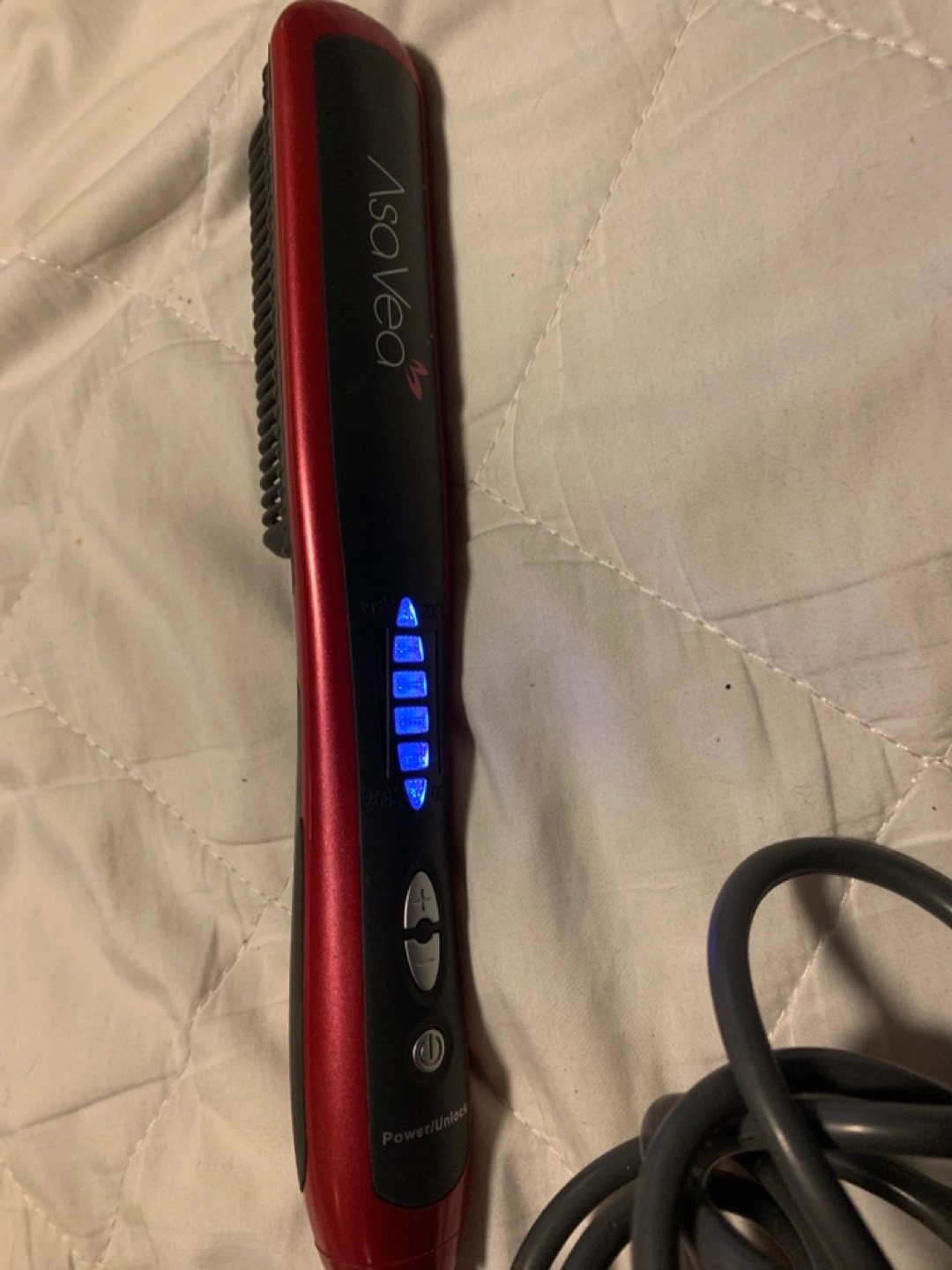 Red hair brush with multiple heat settings. Includes power cord. As seen on tv