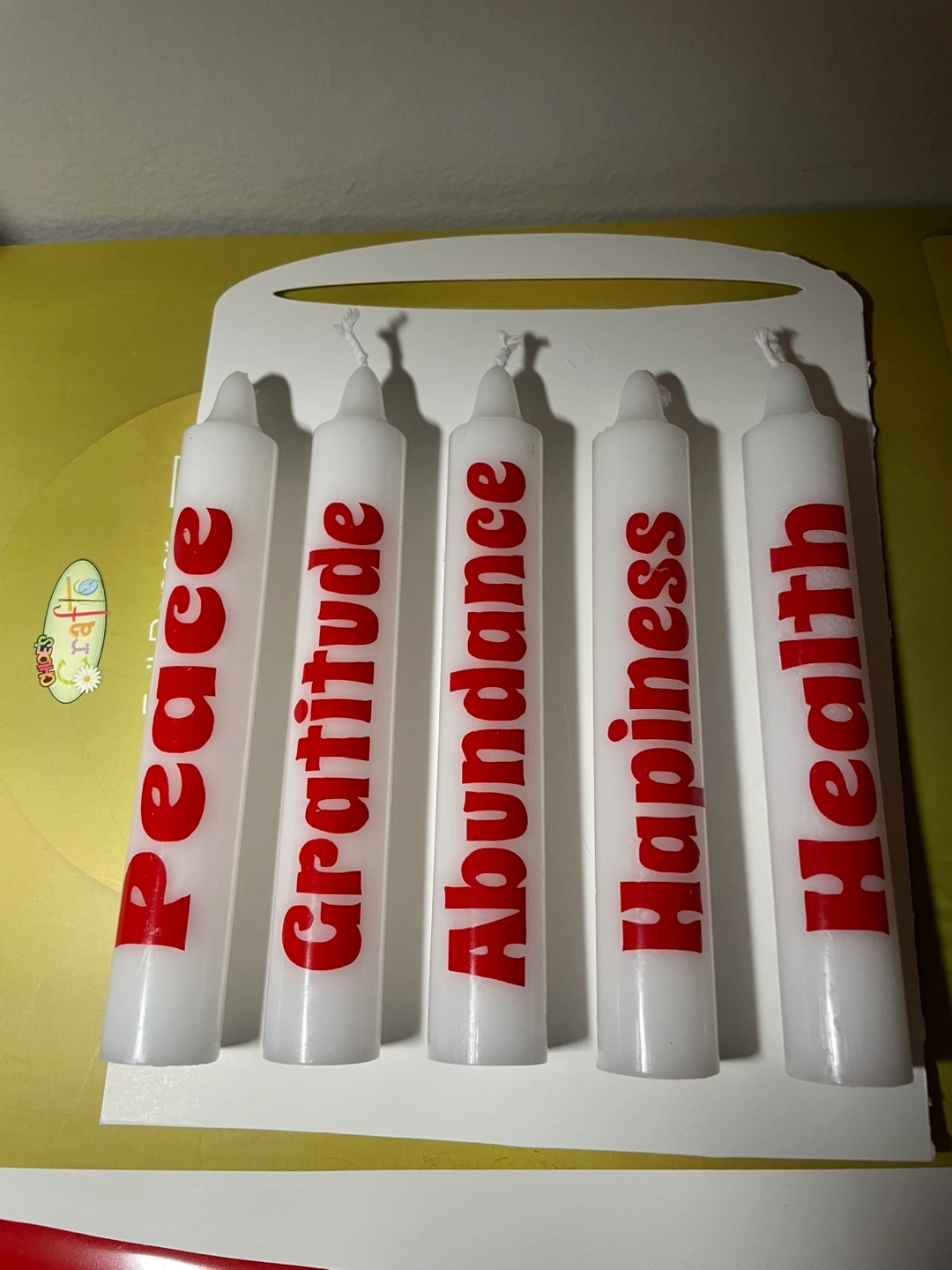 Set of 5 white candles with red words on each: Peace, Gratitude, Abundance, Happiness, and Health.