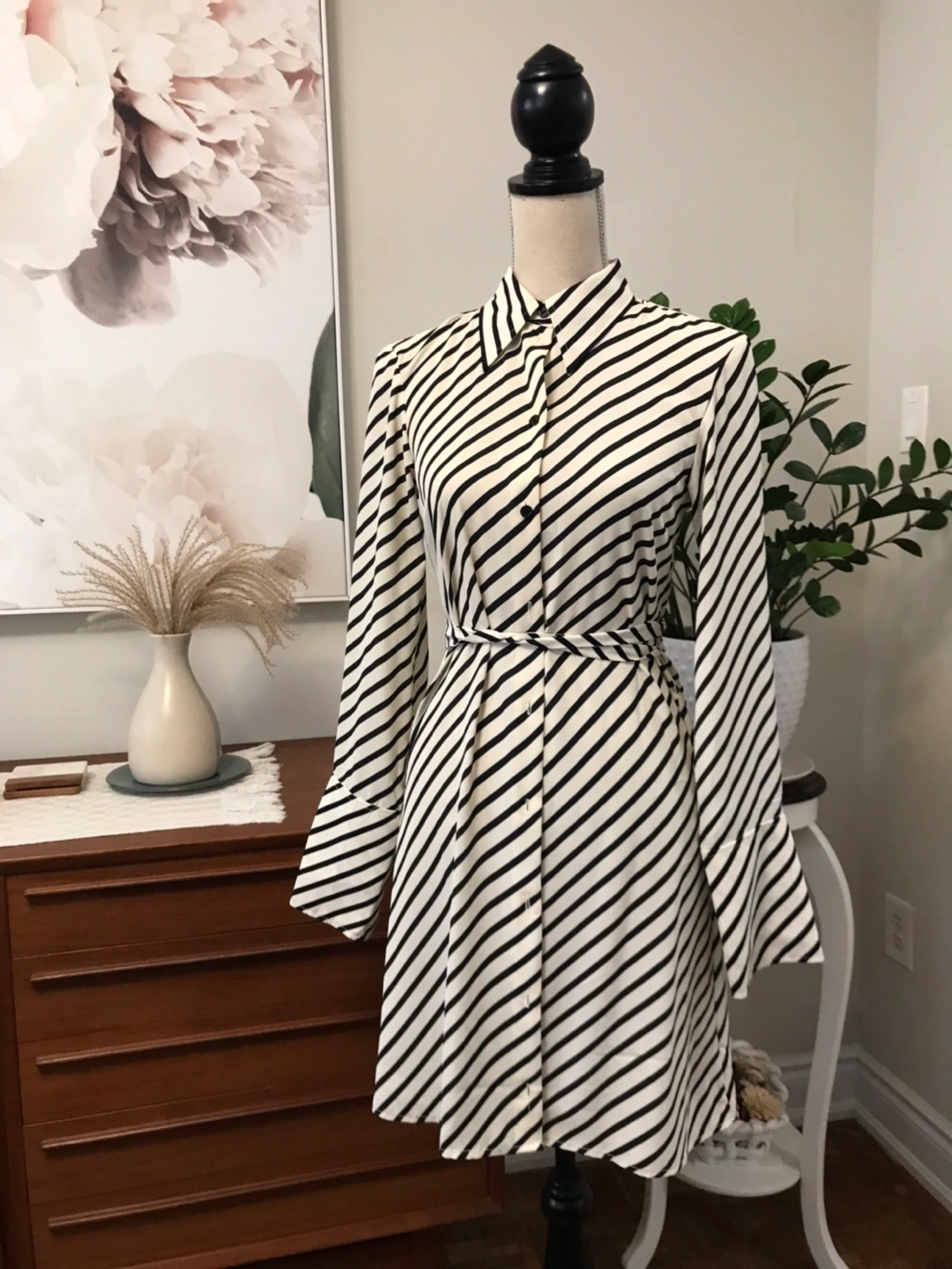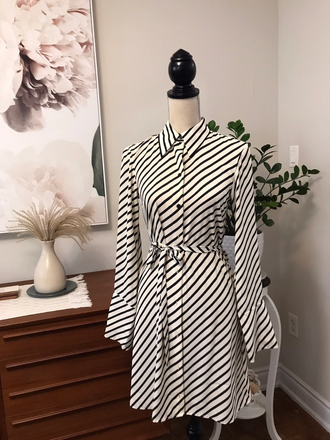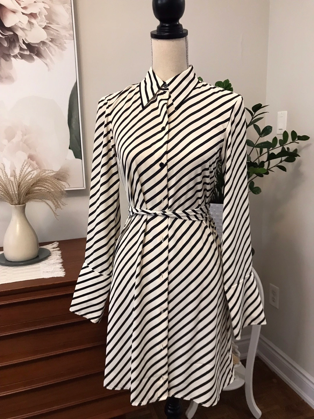 White and black striped dress. Long sleeves, button up front, and a tie belt. Size xs
