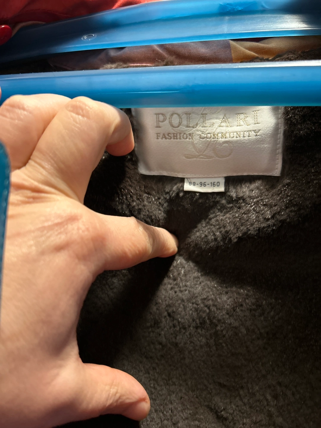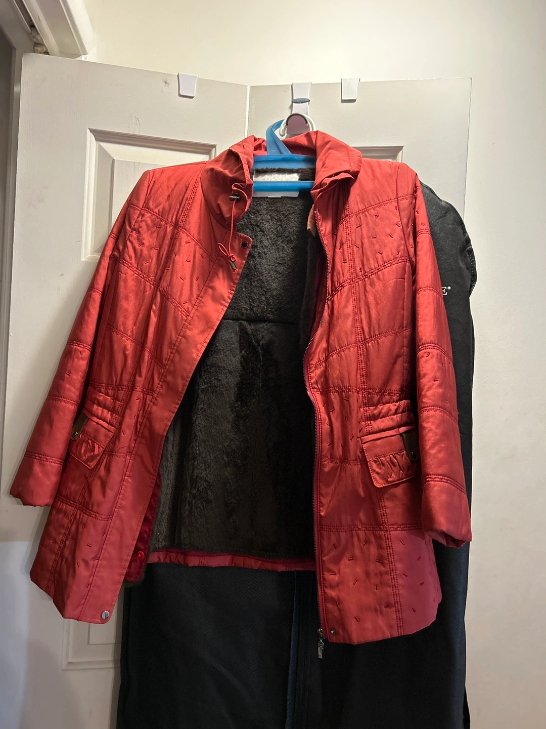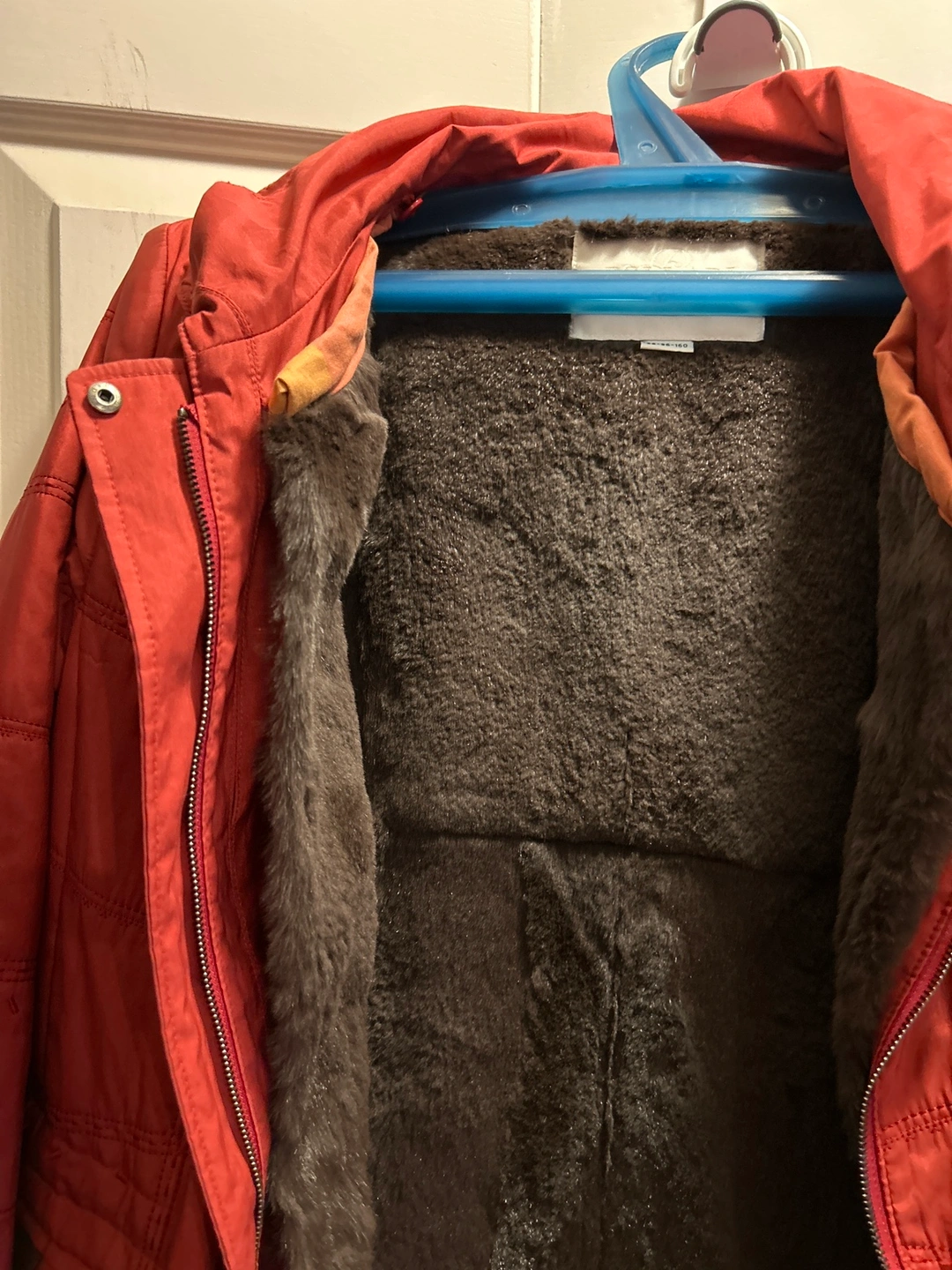 Red winter jacket with faux fur layer, Zipper closure with buttons.