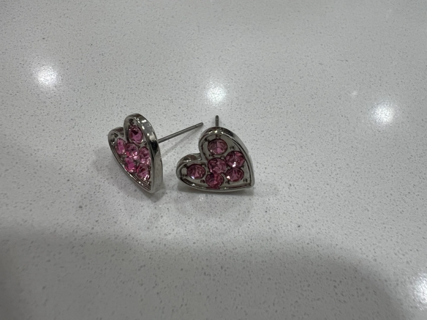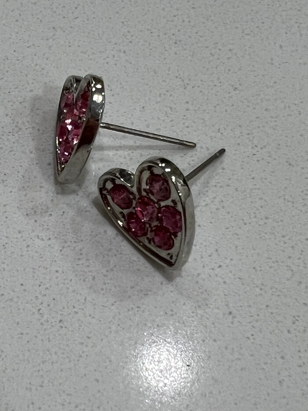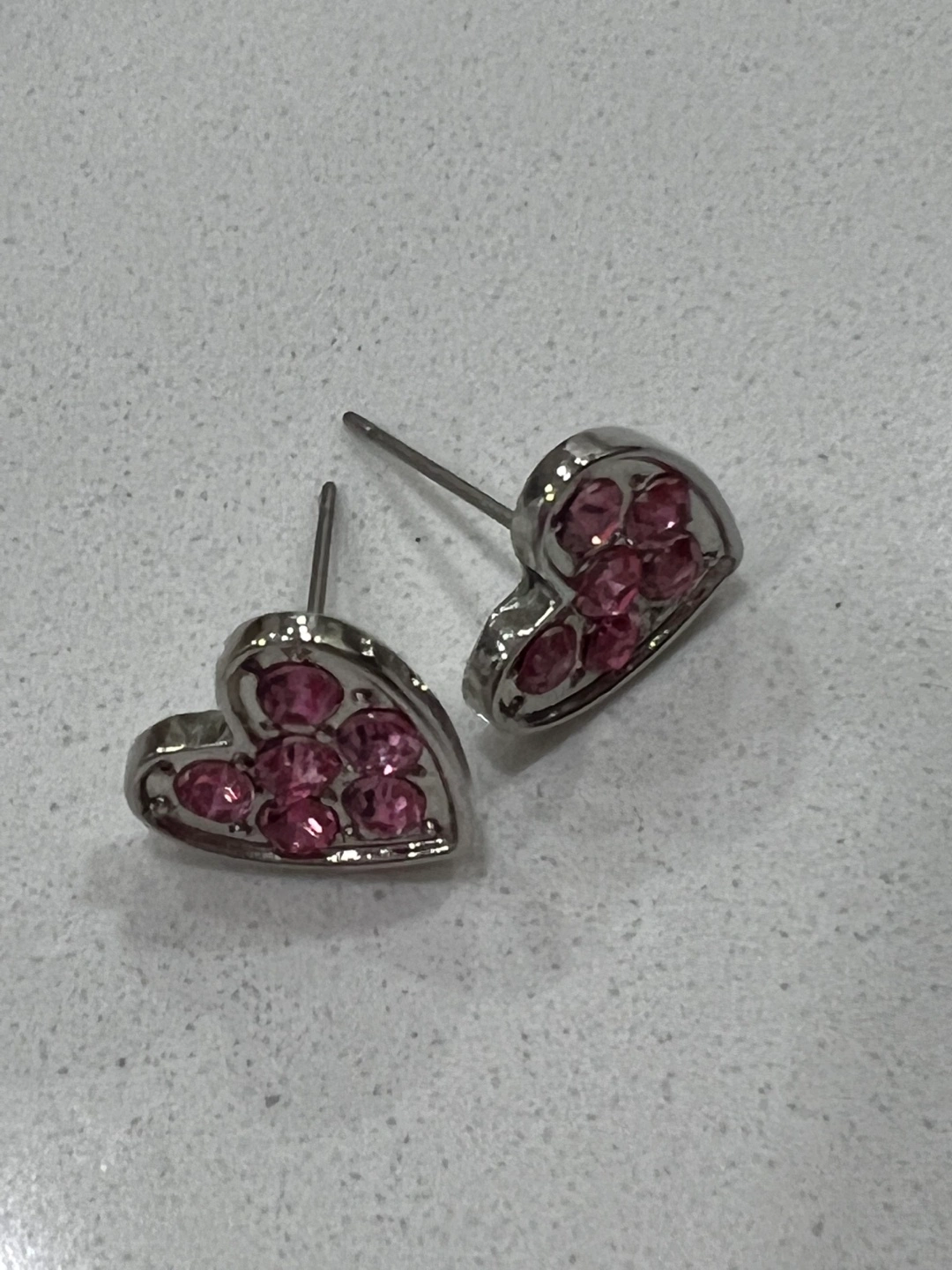 Silver heart-shaped earrings with pink crystals. Costume jewelry. As see in pictures.