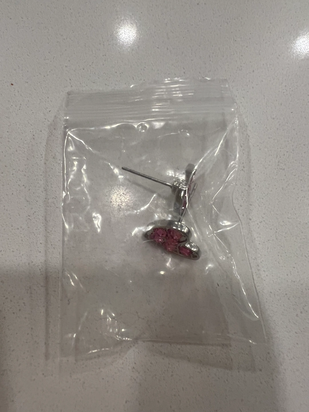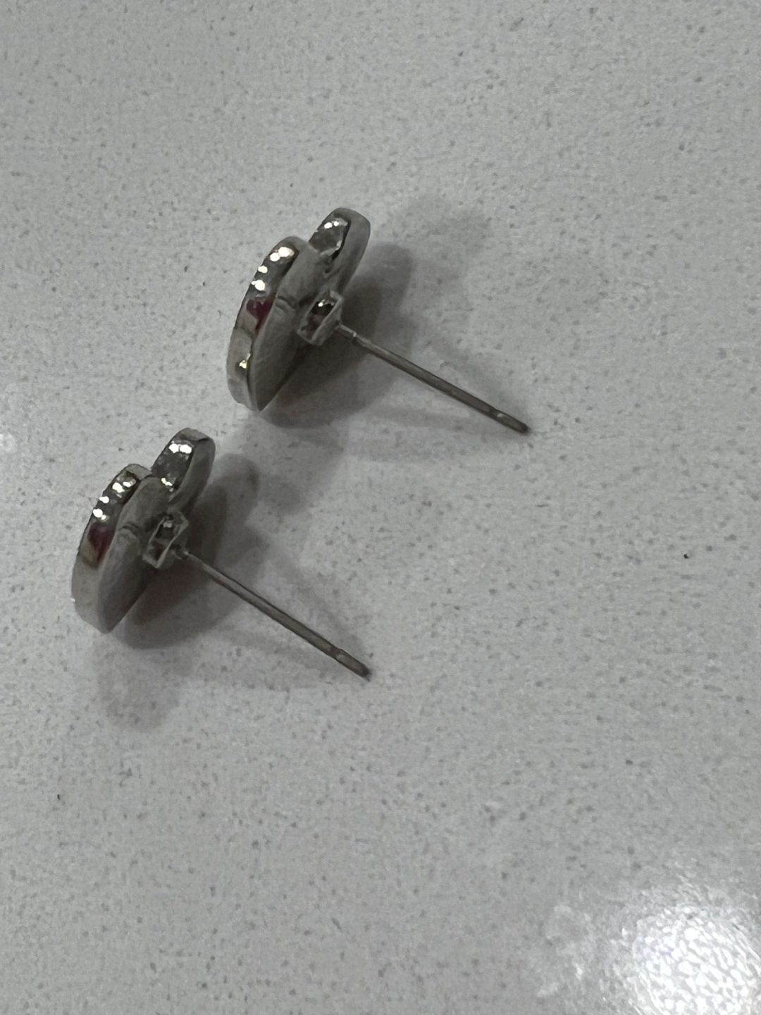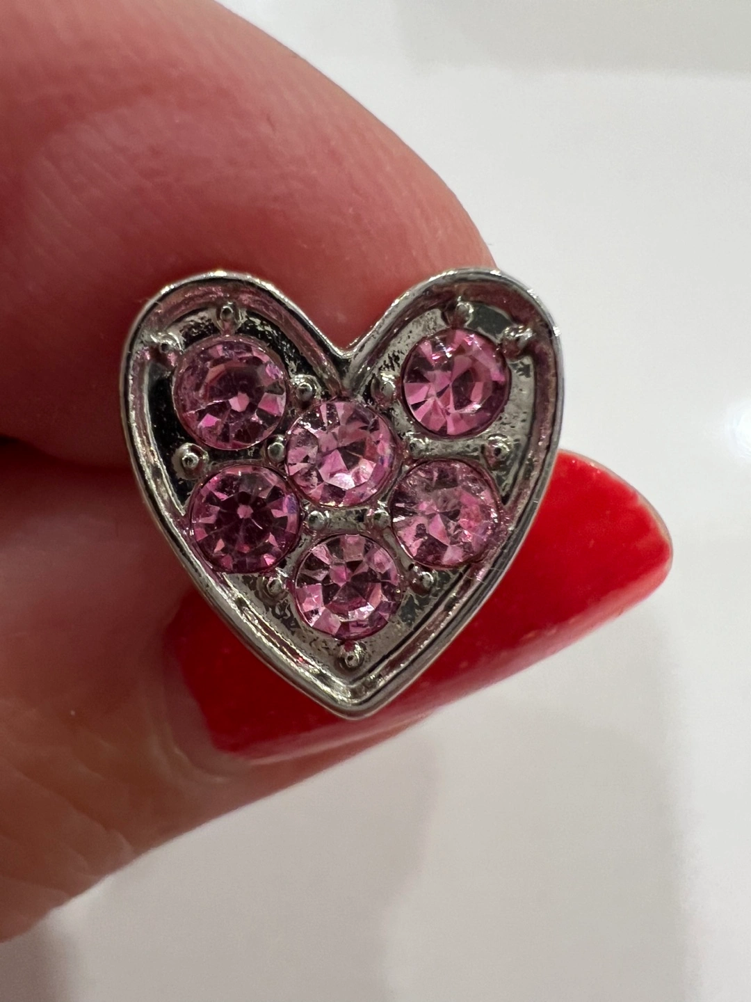 Silver heart-shaped earrings with pink crystals. Costume jewelry. As see in pictures.