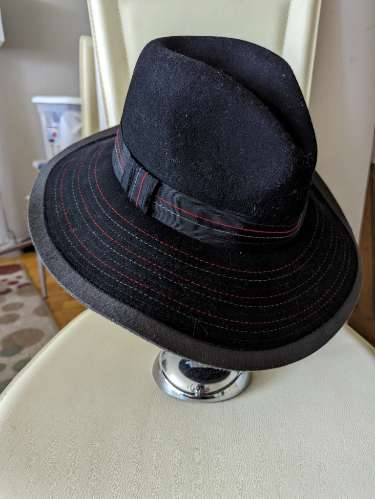 *Brand New* *100% Wool* *Retail $75*Black fedora with red trim and a red and white ribbon* *Wide Rim*