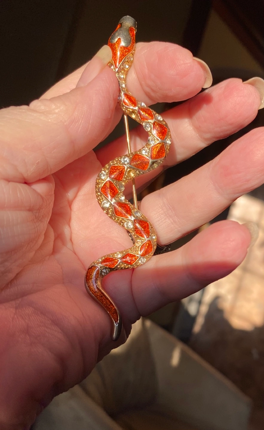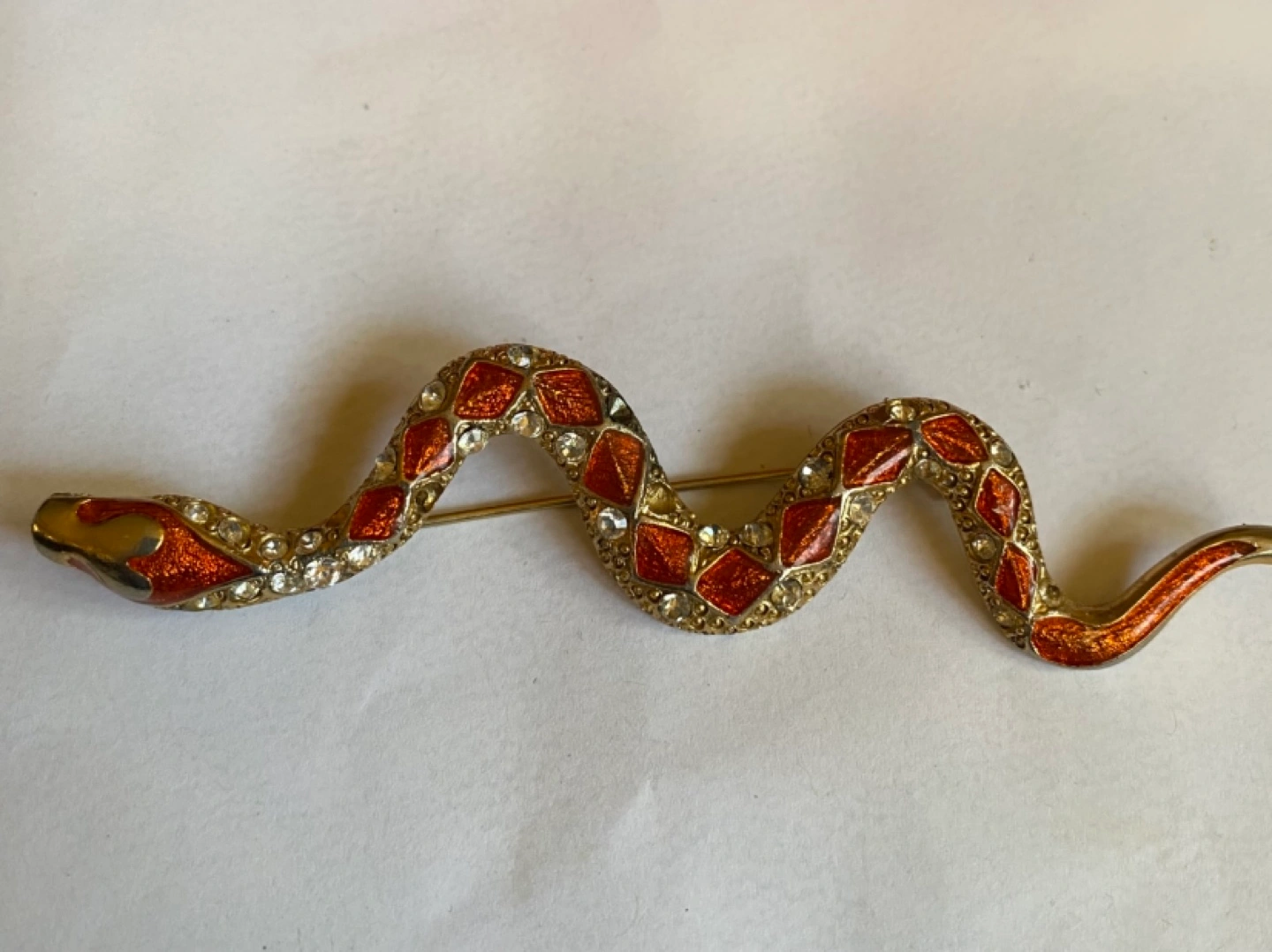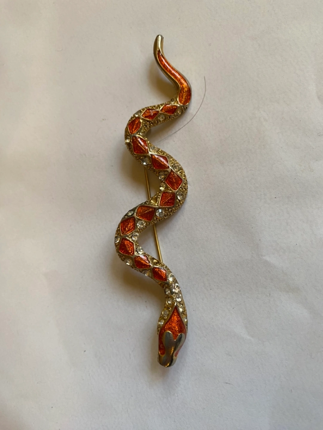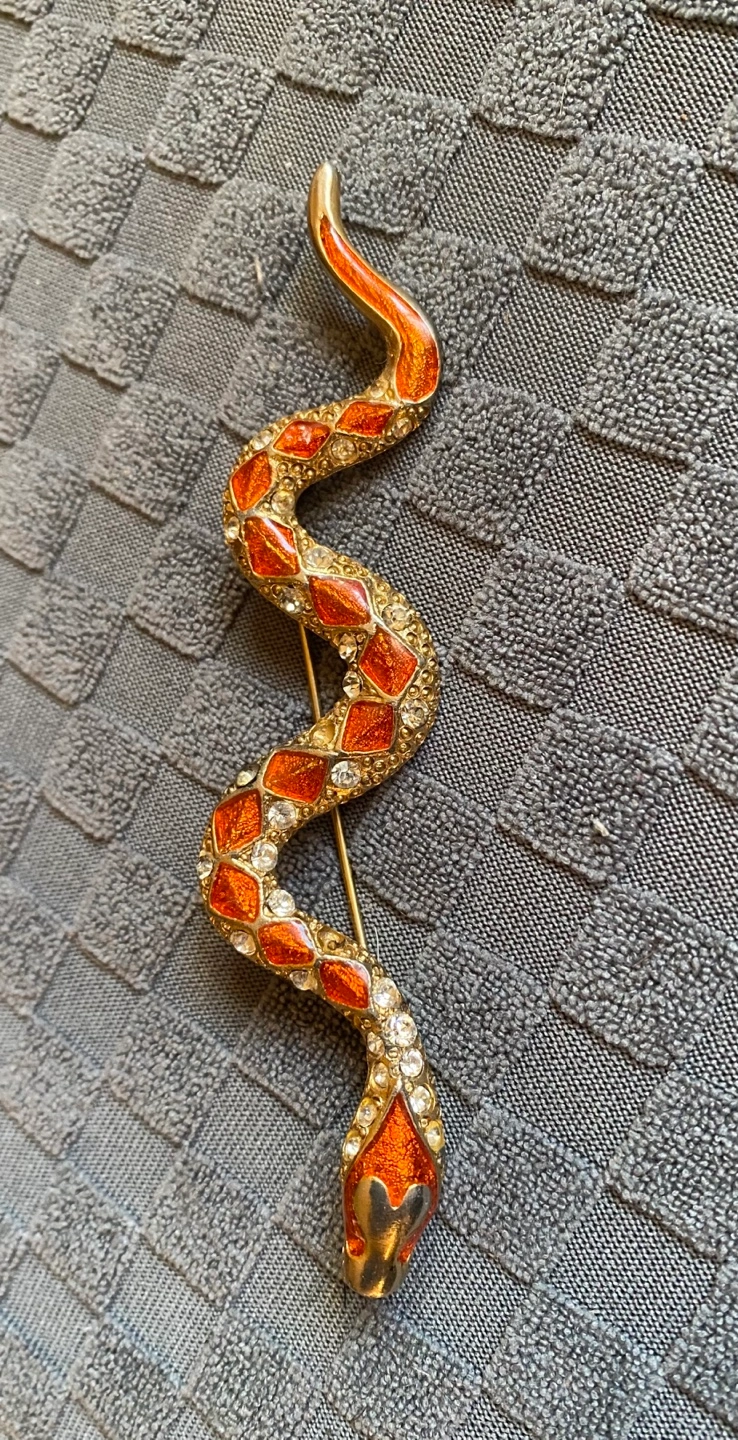 Gold tone snake brooch with red enamel and clear rhinestones. Measures approximately 3 inches in length. Excellent condition for its age. Needs a new home .
