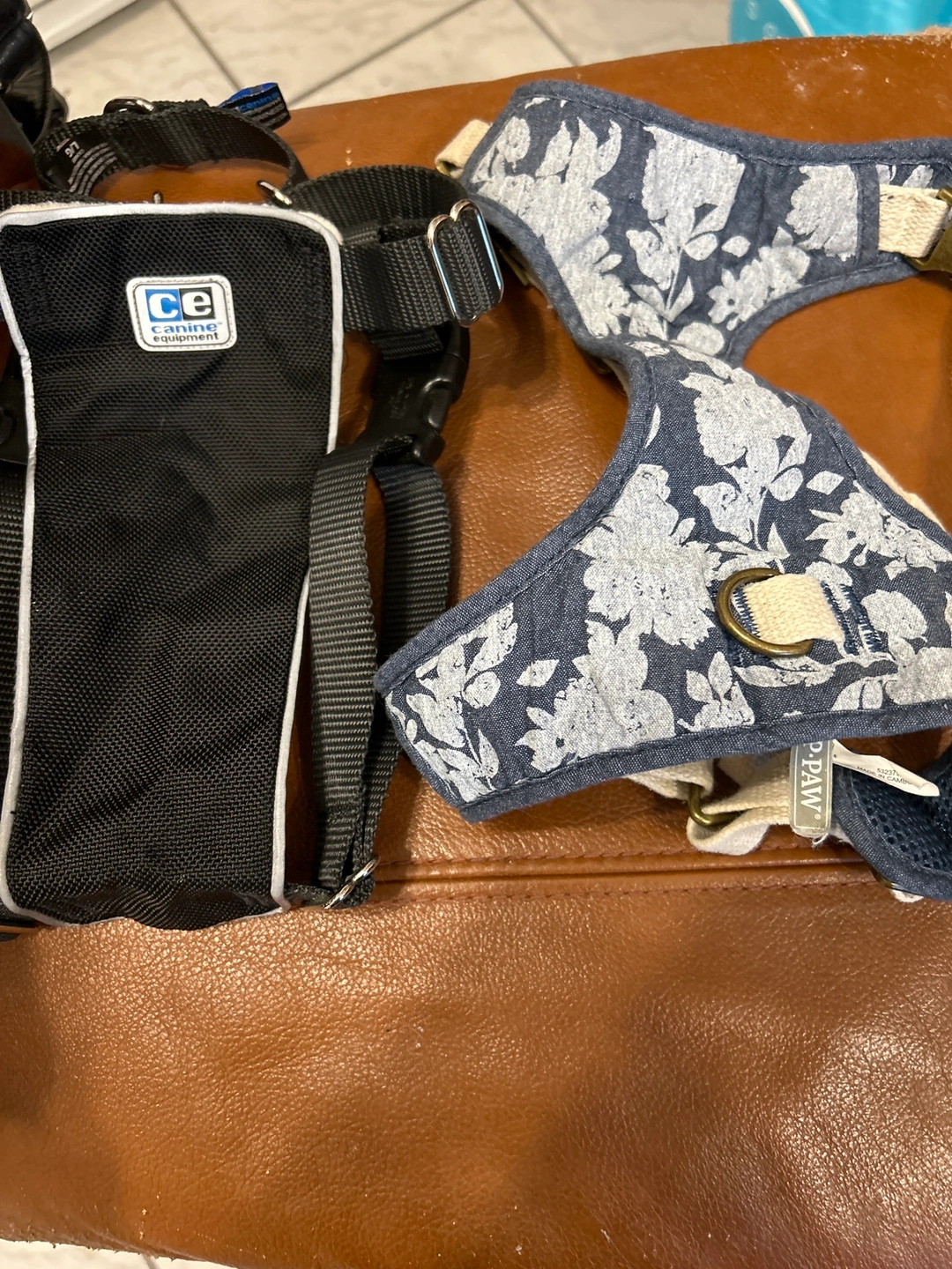 Two dog harnesses, one black and one blue with a floral pattern. Both have adjustable straps and a metal ring for attaching a leash.