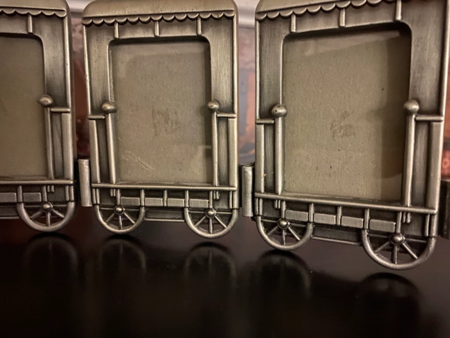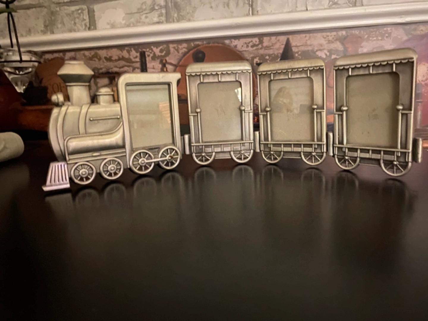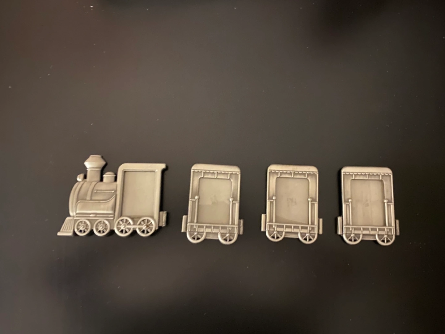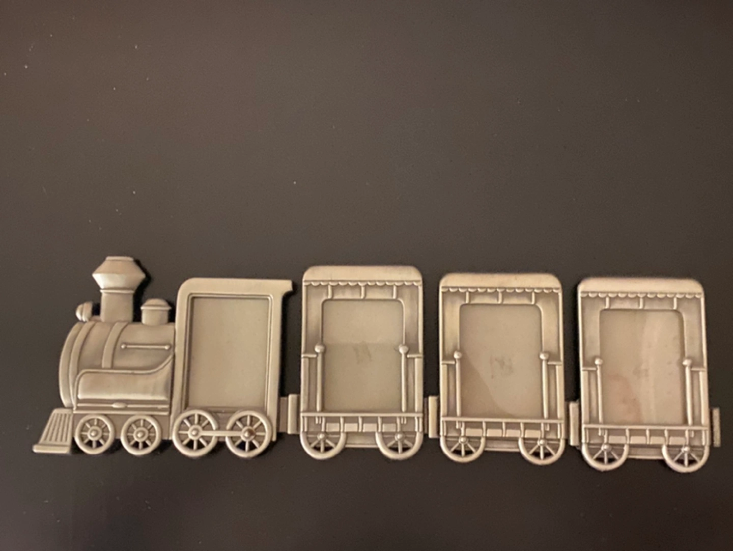 Pewter train photo frame set! Four picture slots. Great for school pictures and the train enthusiasts! They detach if desire. Excellent Condition! Cash only, pick up only, Cawthra and Lakeshore area in Mississauga.