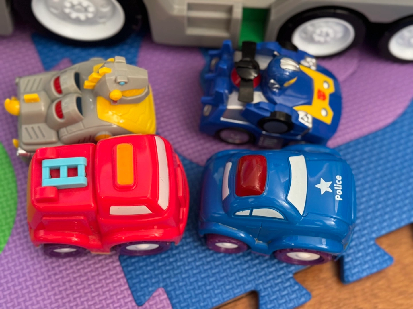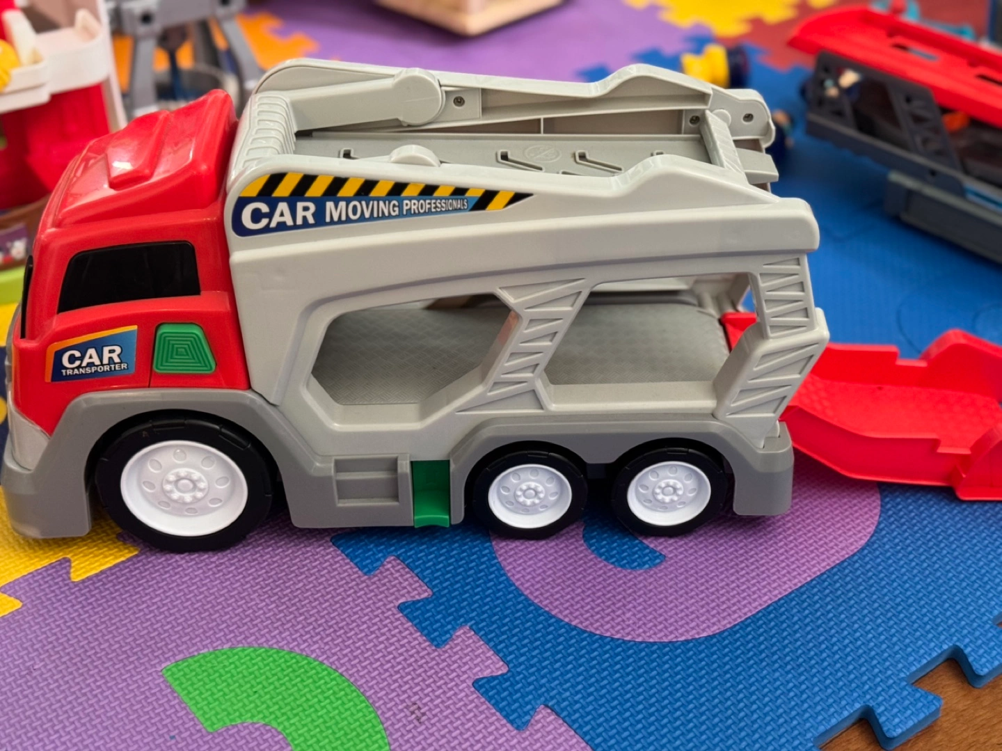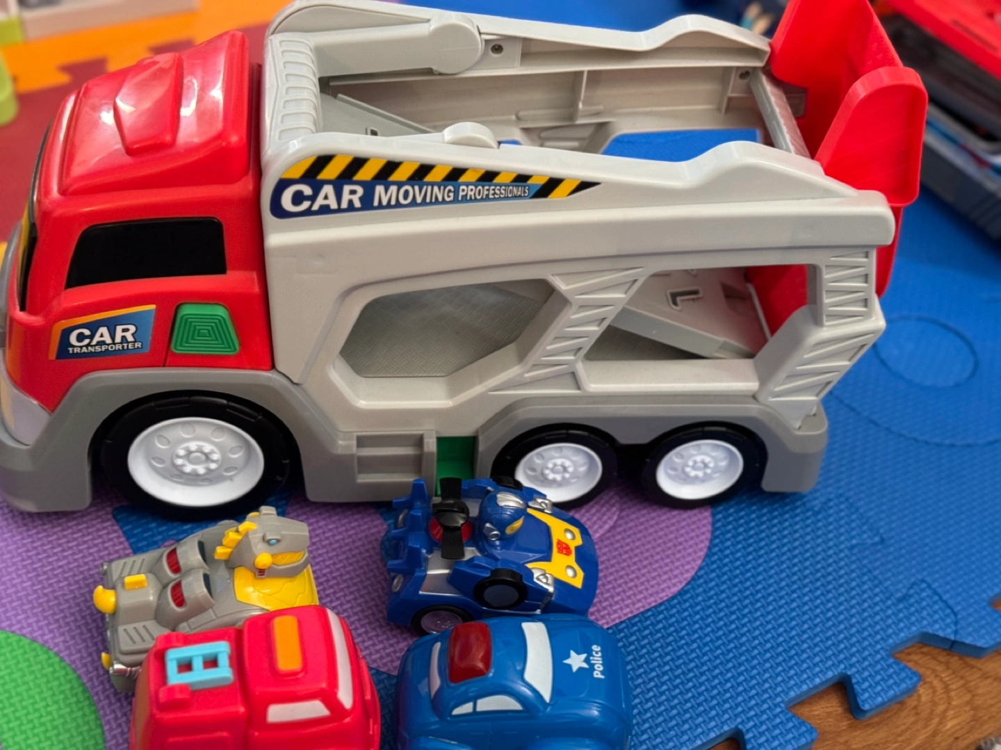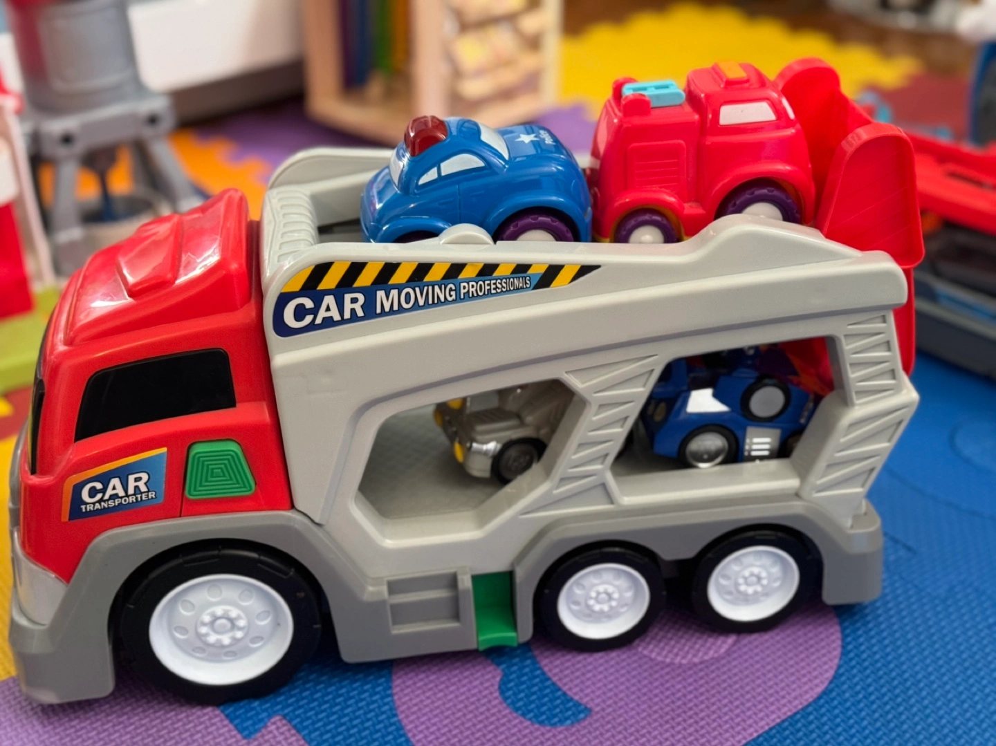 Toy truck that can carry other toy cars. It has a ramp that lowers and a working steering wheel. Includes four toy cars.