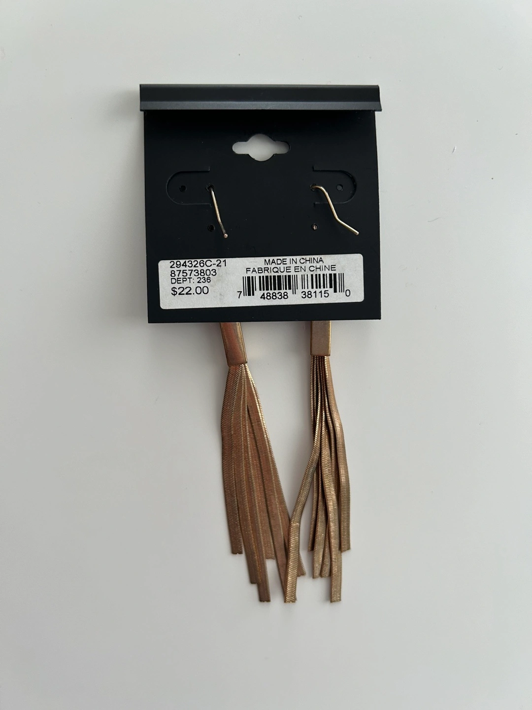Gold tassel earrings with a small clear stone at the top of the earring. Worn few times but they are a bit heavy for me. They look gorgeous though!