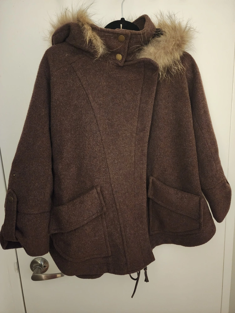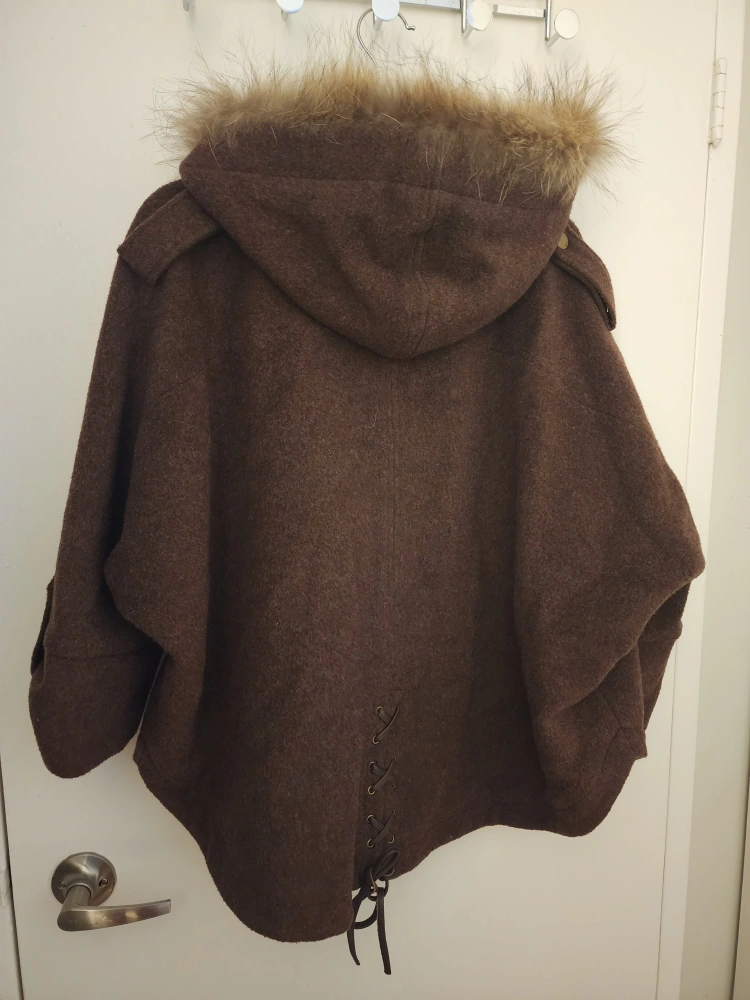 Brown wool jacket with fur trim hood. Has a lace-up back and two pockets.
