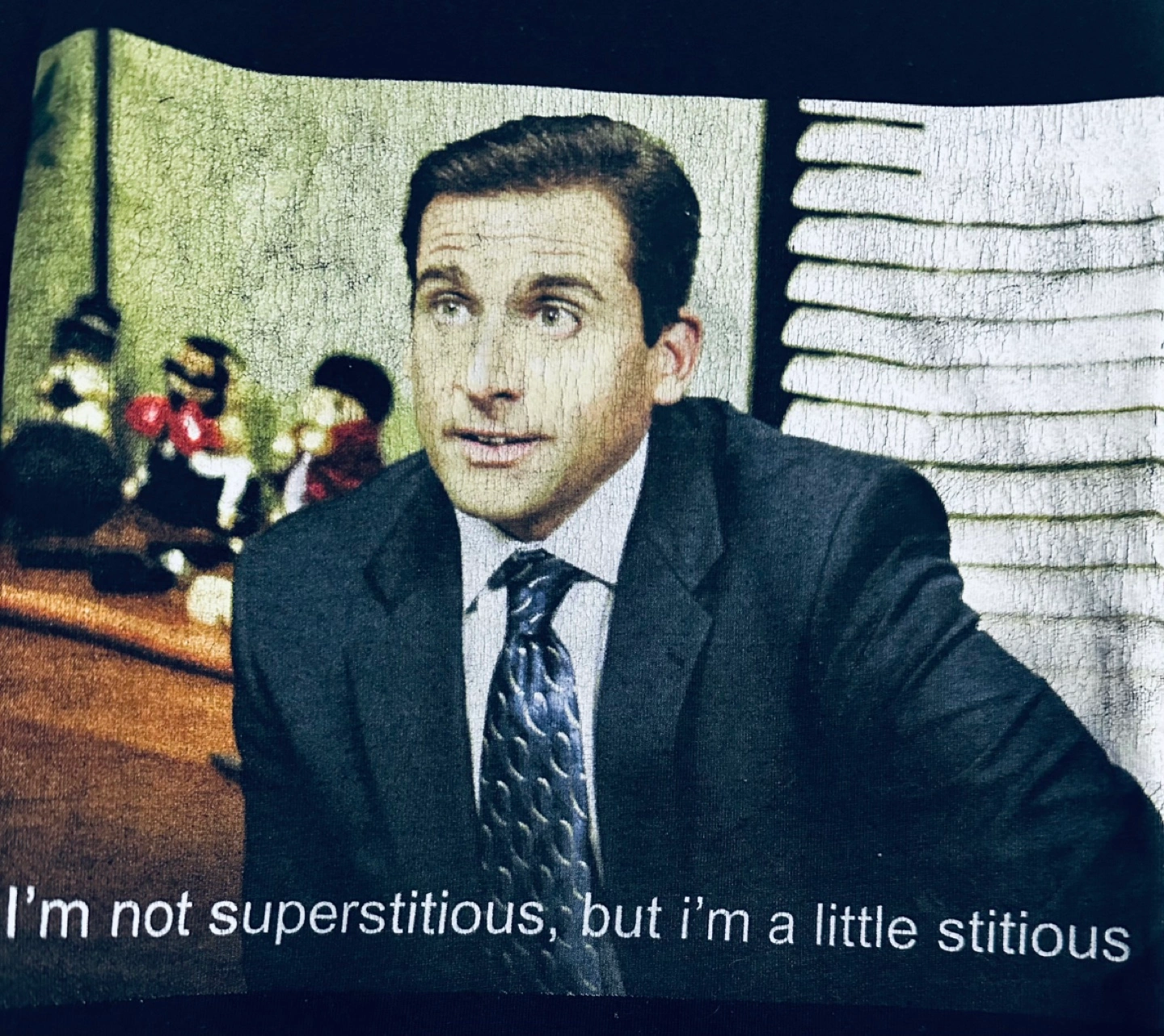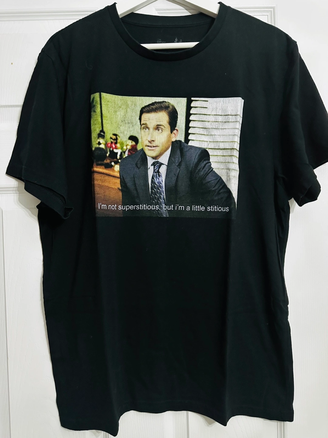 Black t-shirt featuring a print of Michael Scott from The Office. Size Large.