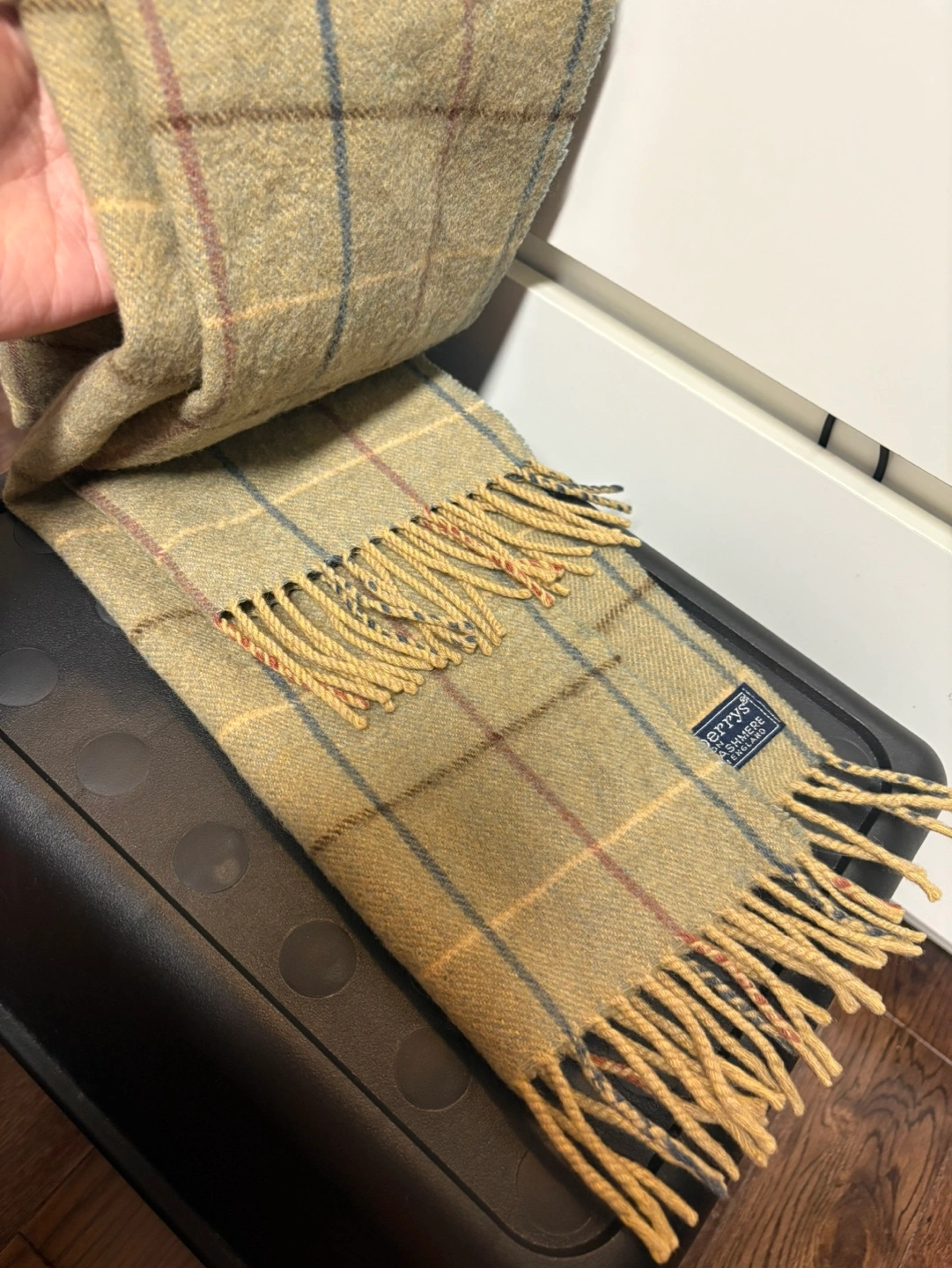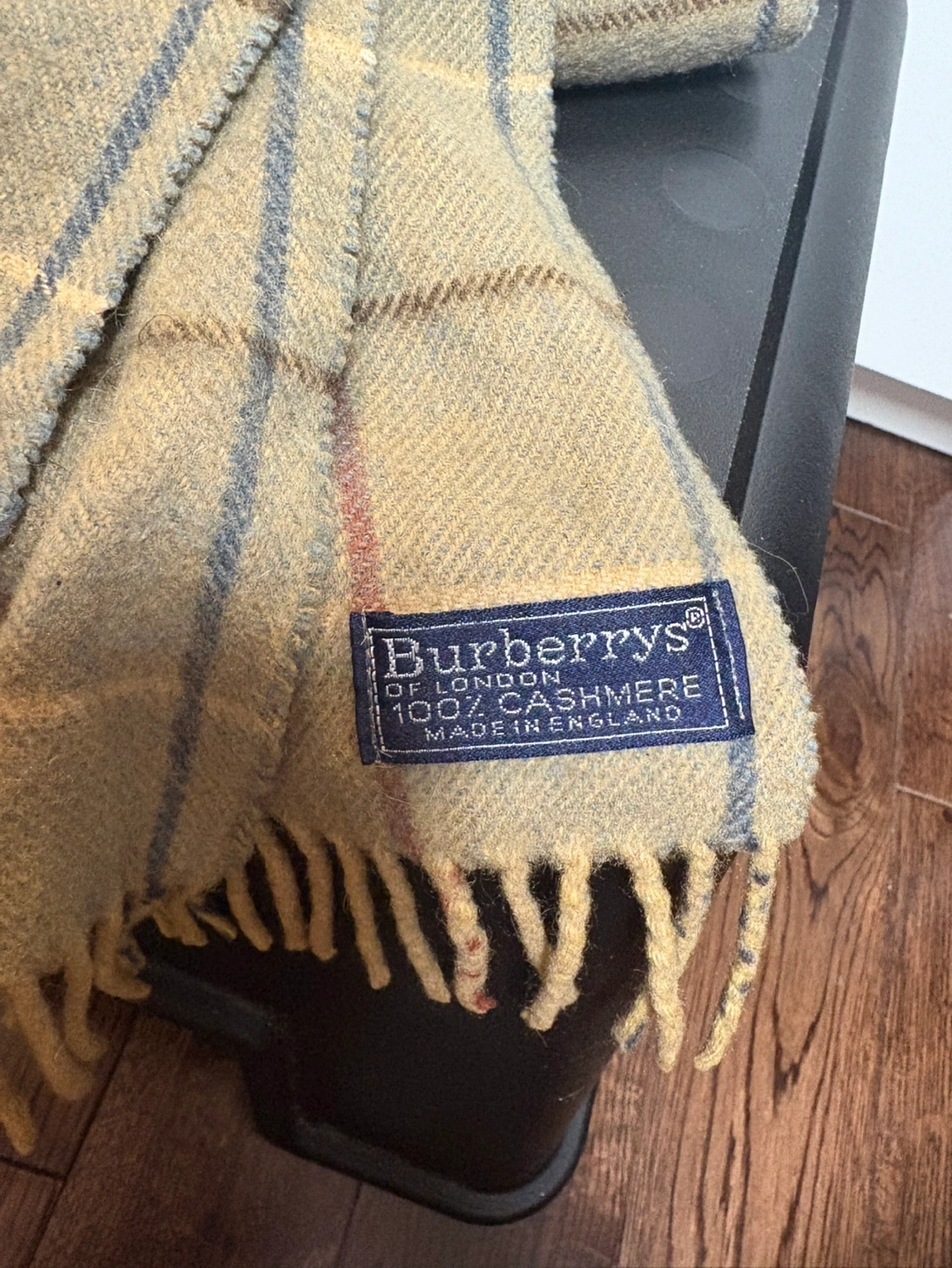 100% cashmere scarf with a plaid pattern. Made in England. Exude classic elegance with this vintage-inspired scarf, featuring a timeless check pattern in a rich blend of colors. The design showcases a harmonious interplay of neutral and deep tones, finished with fringed edges that add a touch of sophistication and texture to any ensemble. Perfect as a statement piece or a complementary accessory, this scarf radiates a sense of luxury and heritage. 12 x 52 (inches) 100% Cashmere Authentic!! No stain, no smell 8/10 condition