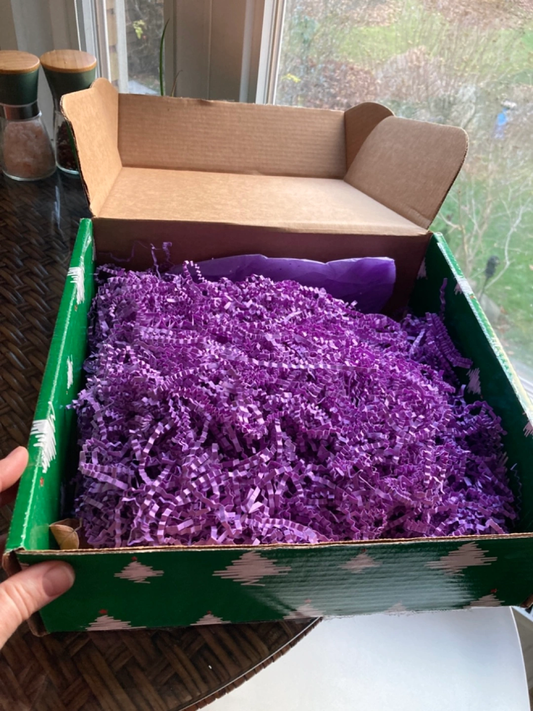 Purple paper shred. Great for packaging gifts or filling a box for shipping.