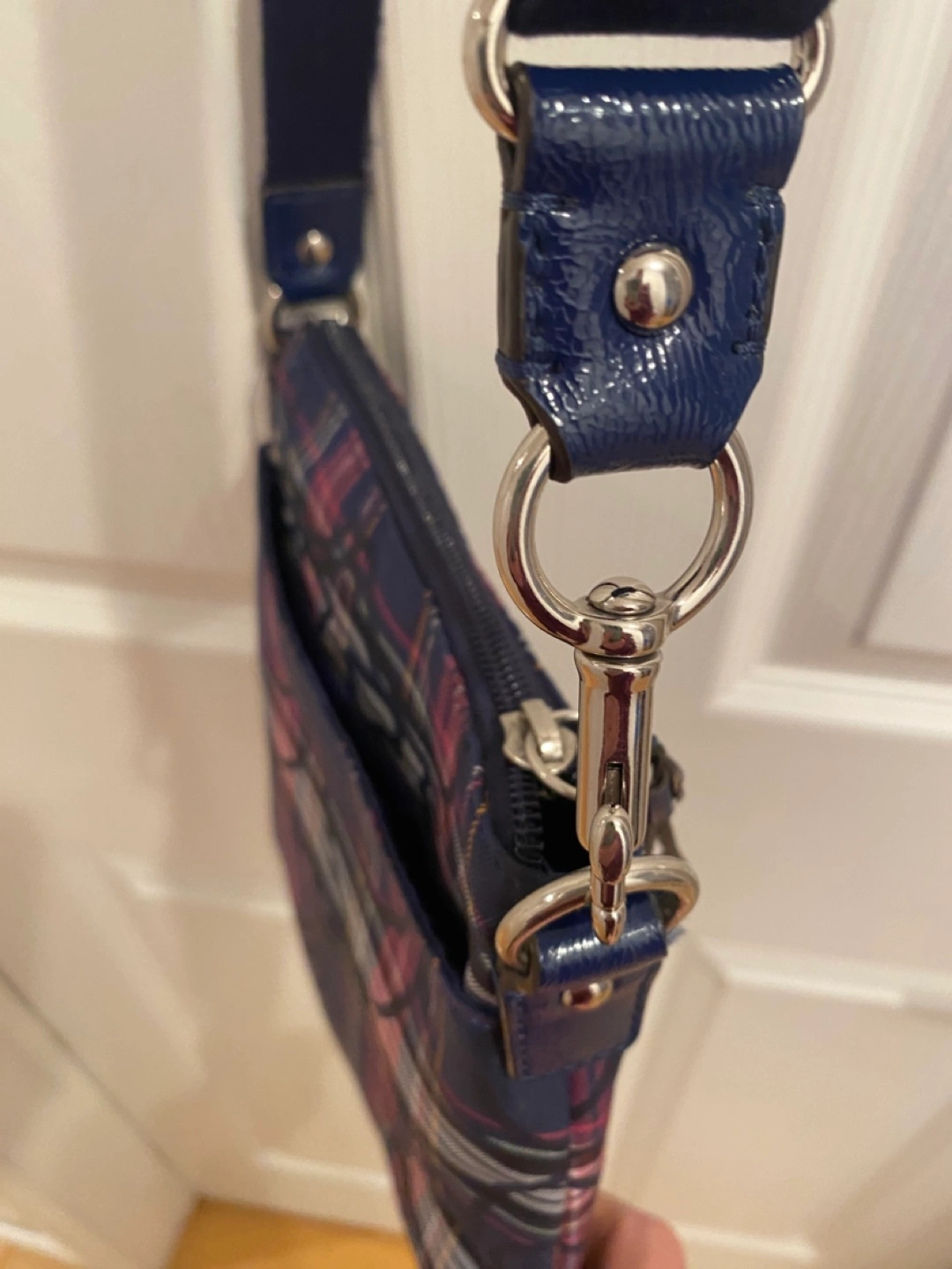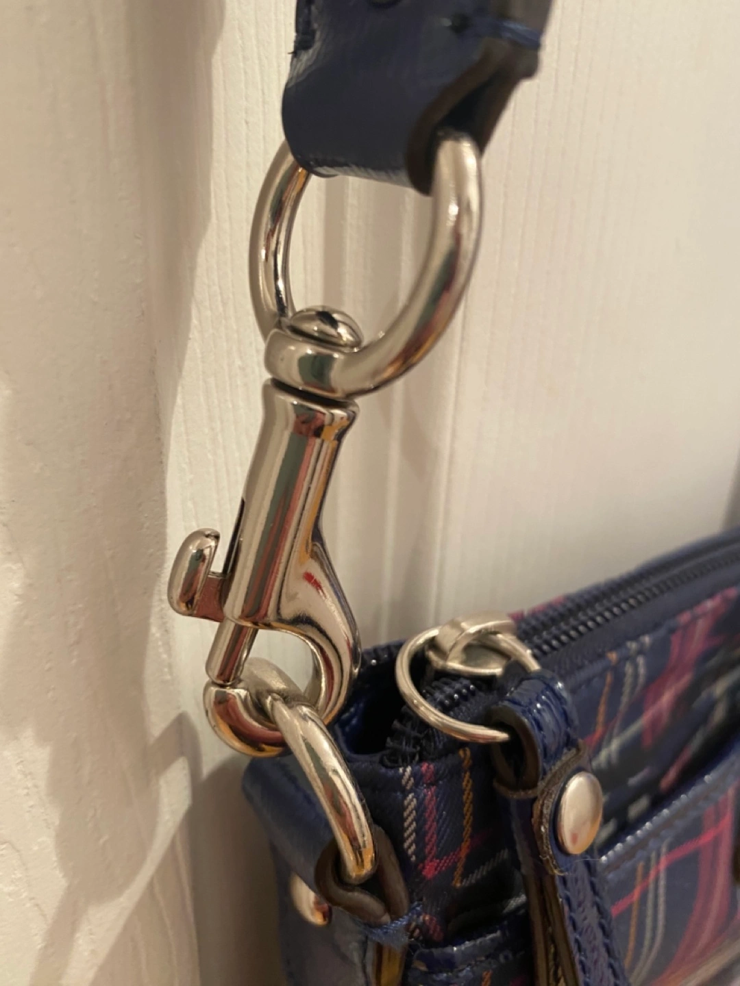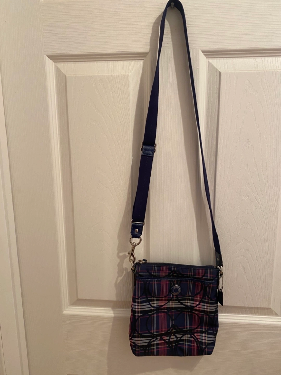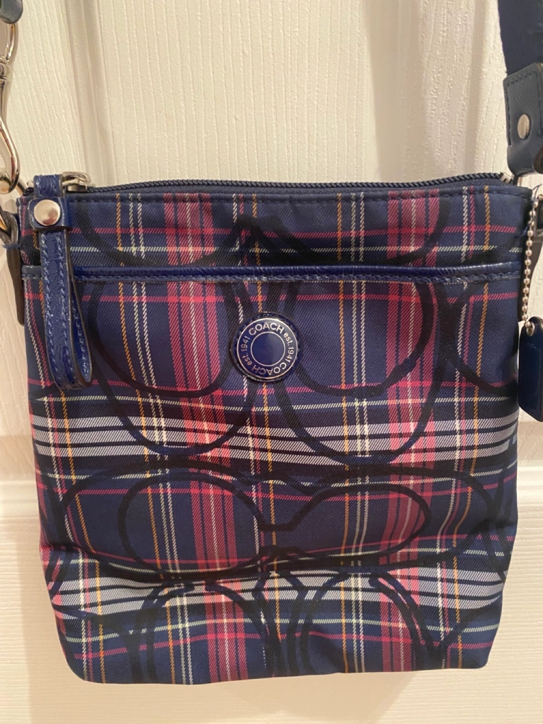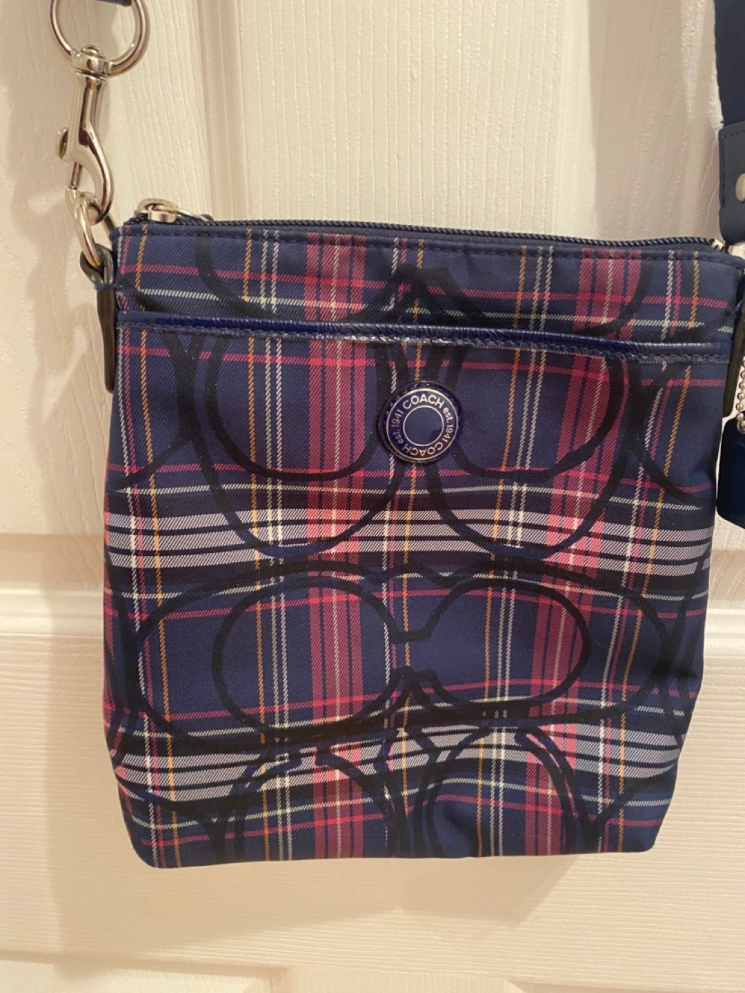 Blue plaid crossbody bag. Has 1 zippered compartment and 2 outside pockets. Adjustable strap. Great Condition! Measures height 9”, width 8.5” Faux Coach Crossbody bag. Pick up only, Cawthra and Lakeshore area in Mississauga.
