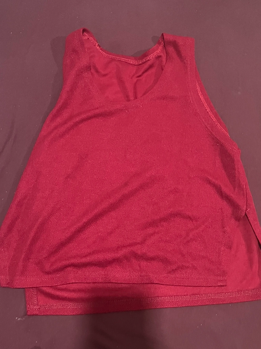 Sleeveless crop top, burgundy colour. Made of a stretchy material. Side small slit