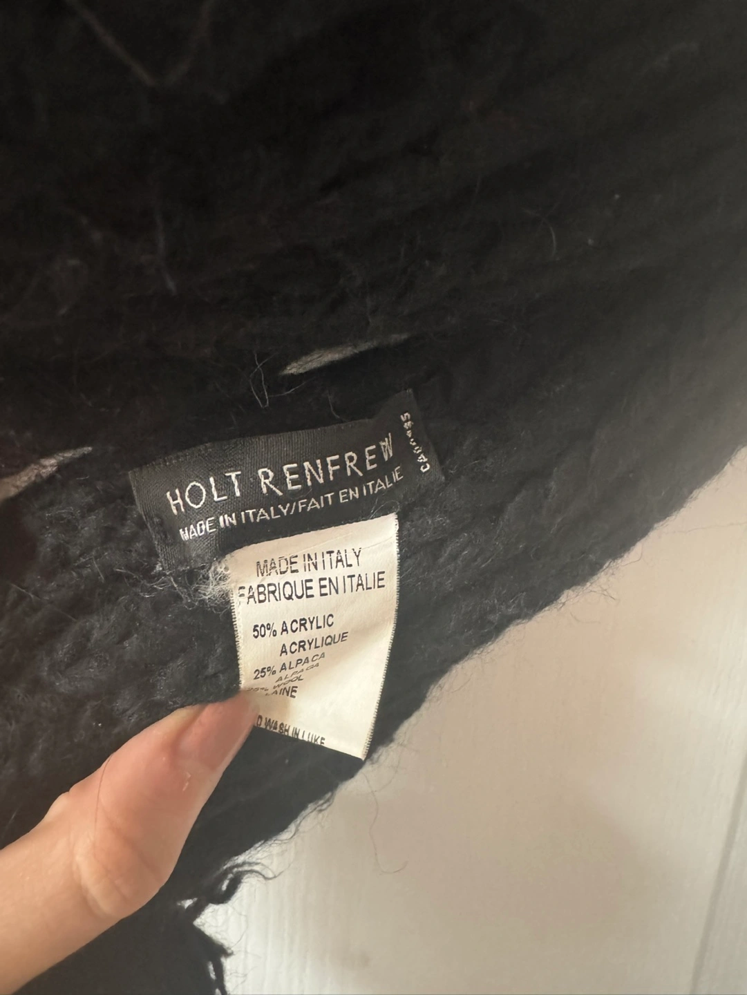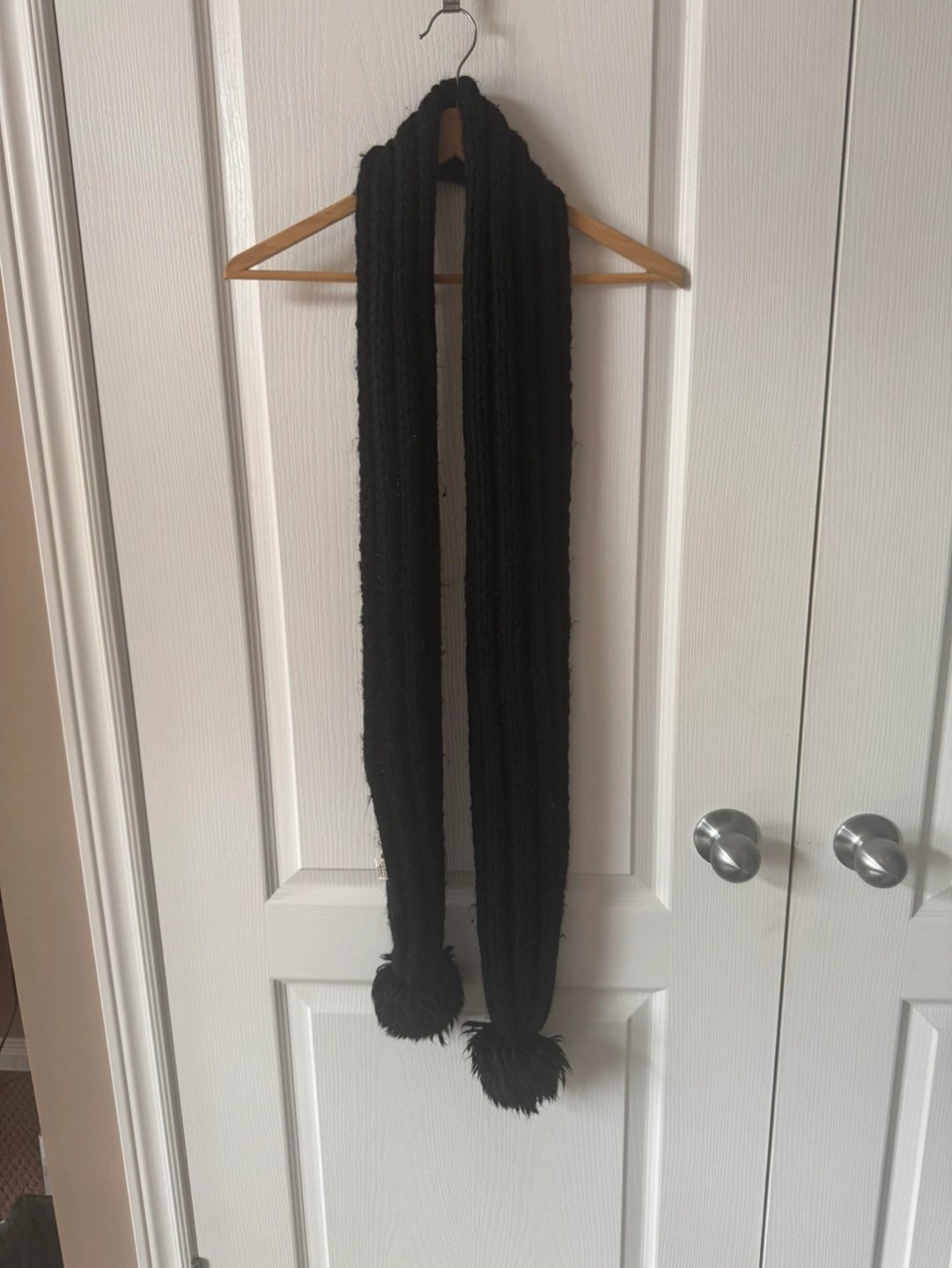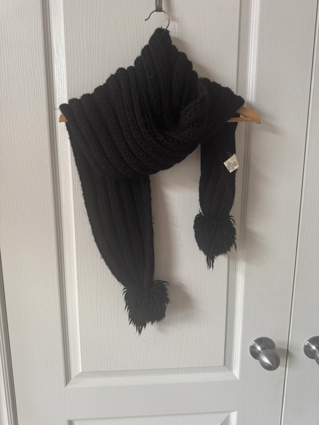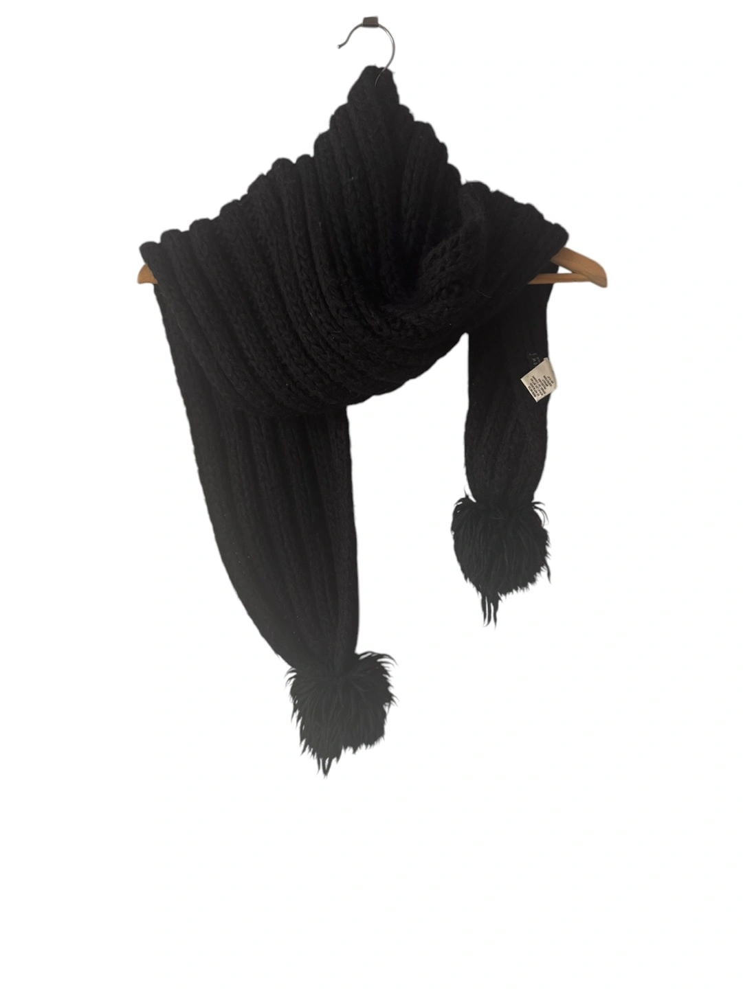 Black knitted scarf with pom poms. Made in Italy. 50% Acrylic, 25% Alpaca, 25% Wool.