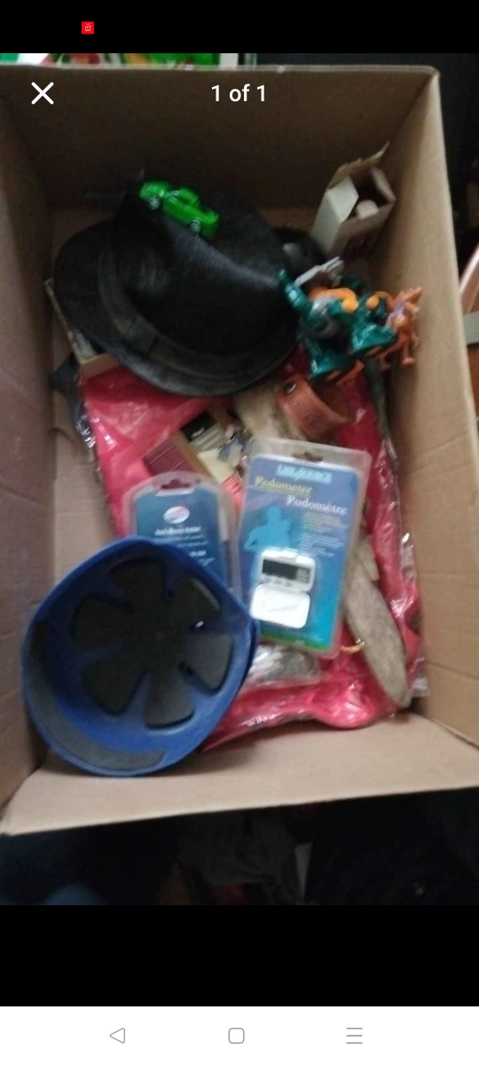 Show allBox of assorted items including a hat, a 2 bump cap helmets, and a pedometer. will be adding random things to it.