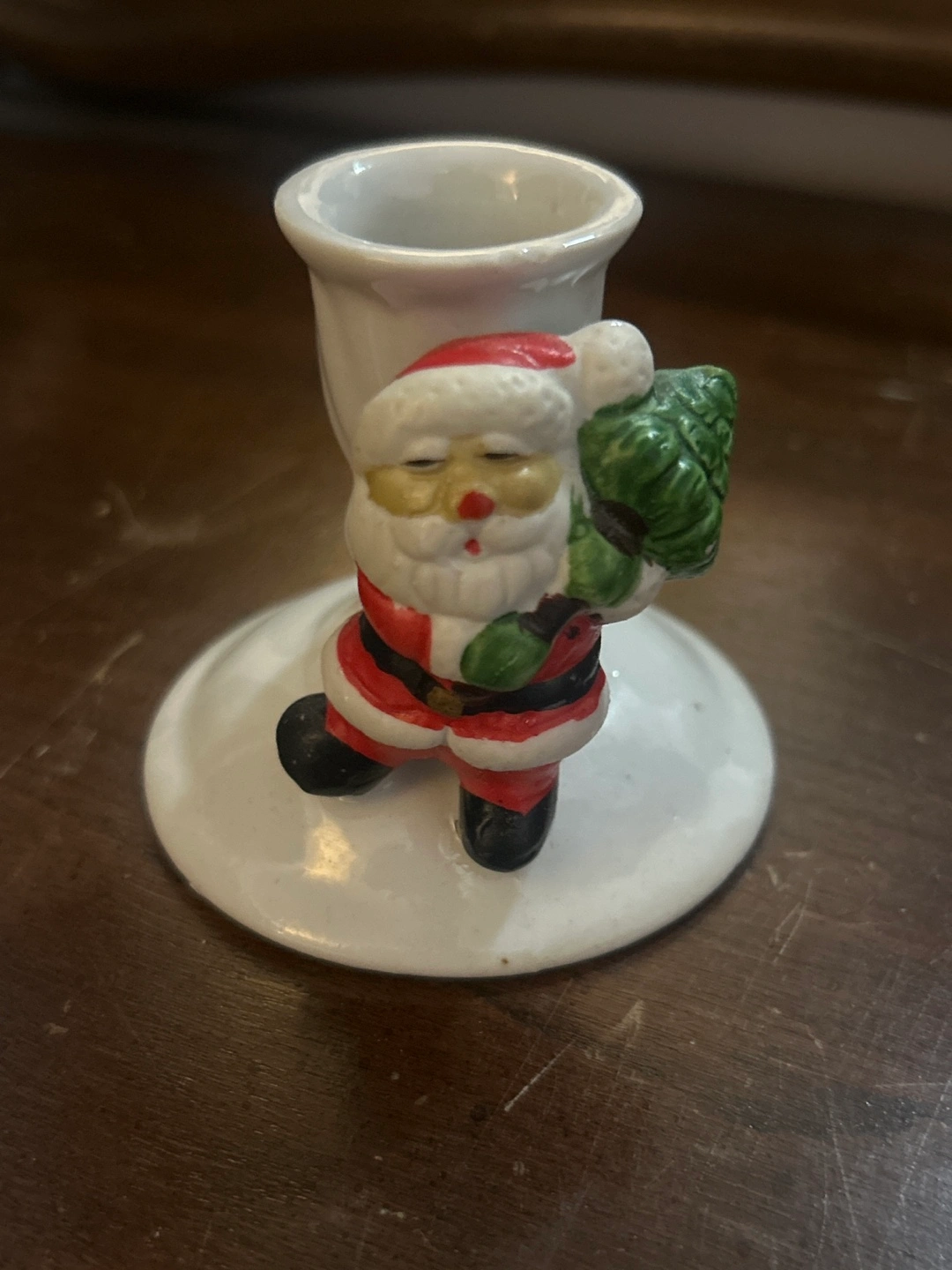 Santa Claus candle holder, holding a tree in his hand. Small and cute.