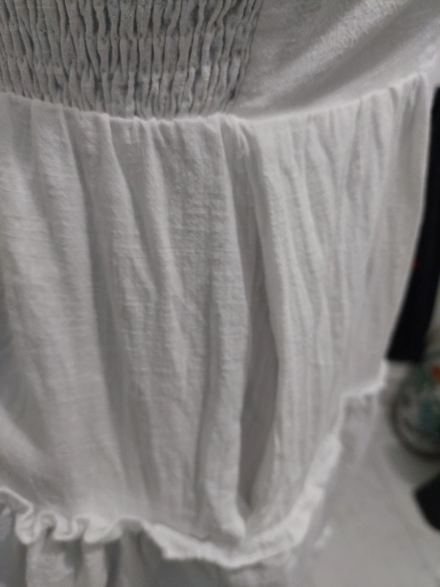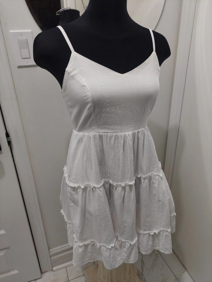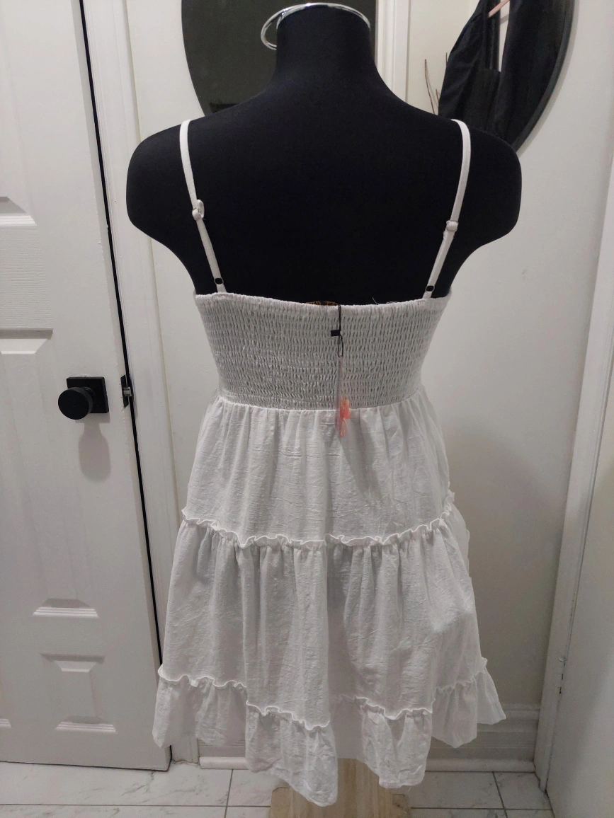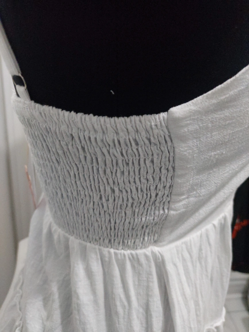White summer dress with spaghetti straps and a tiered skirt. Elastic smocked waistband.
