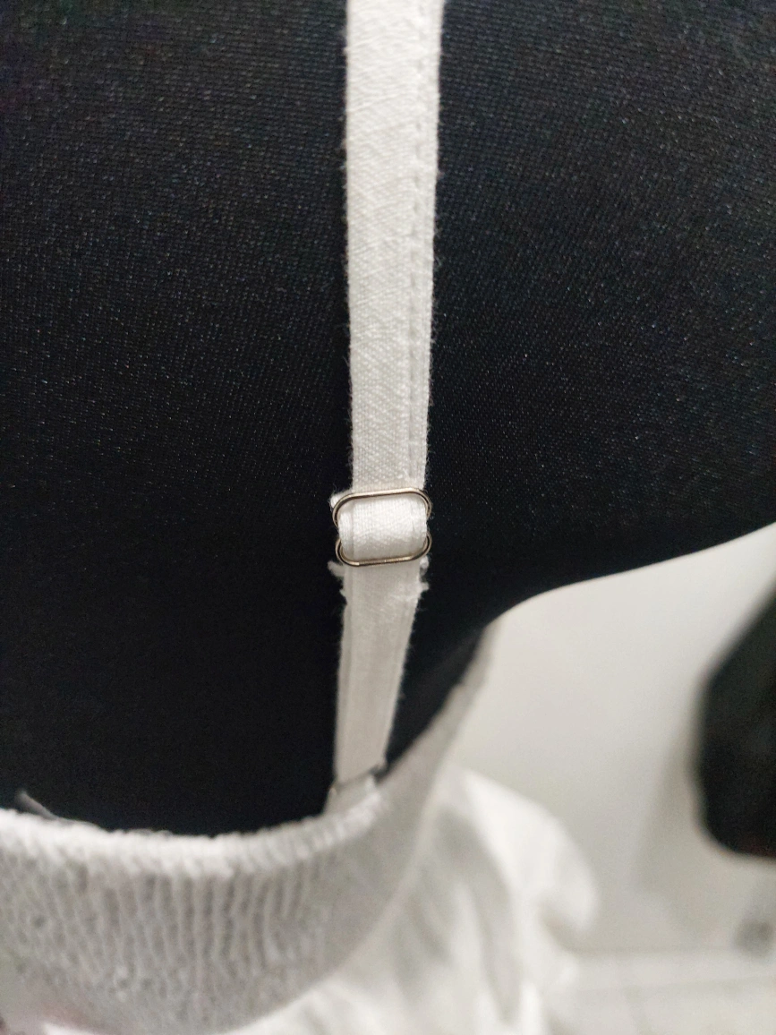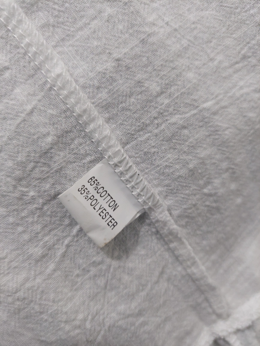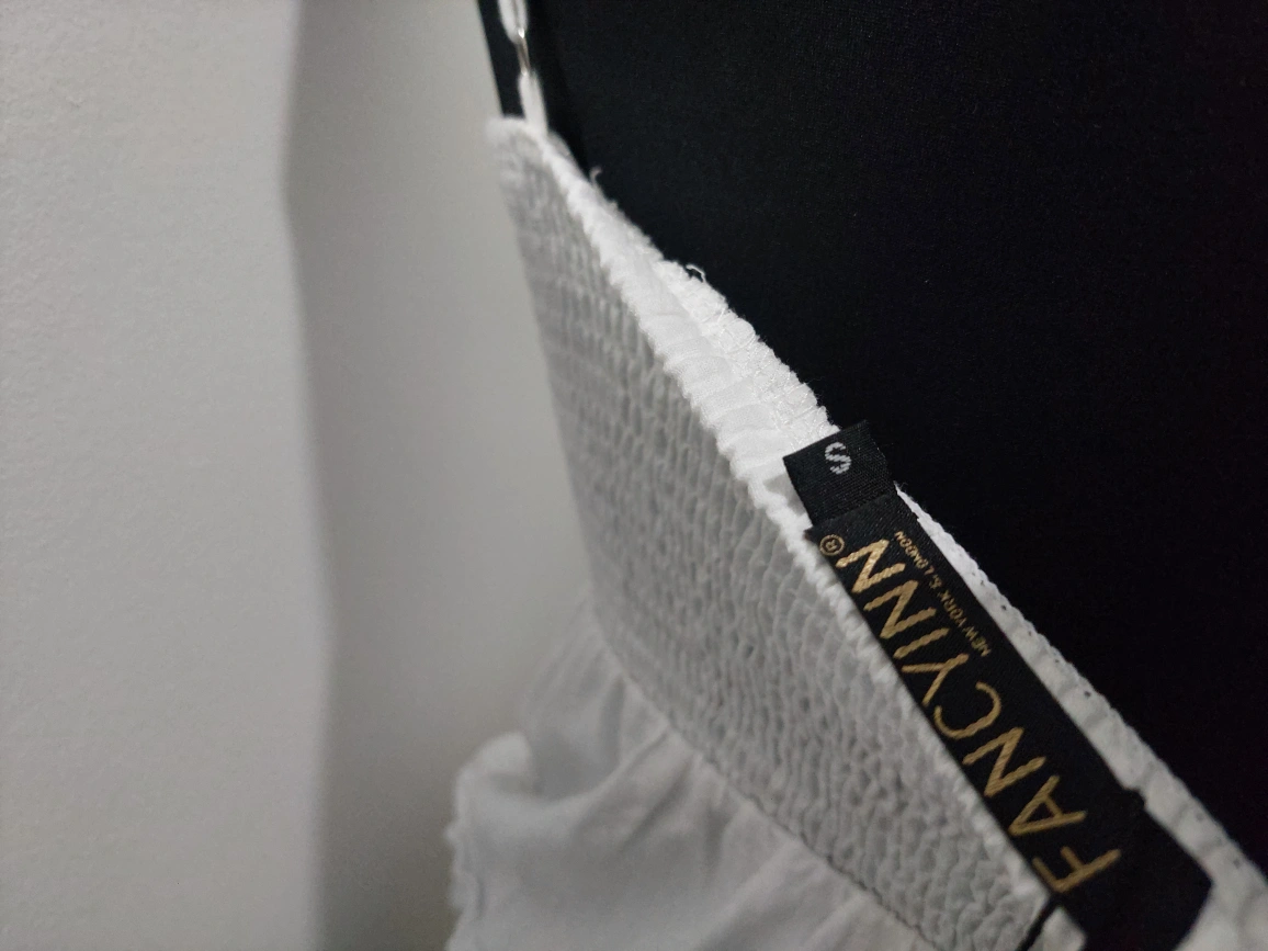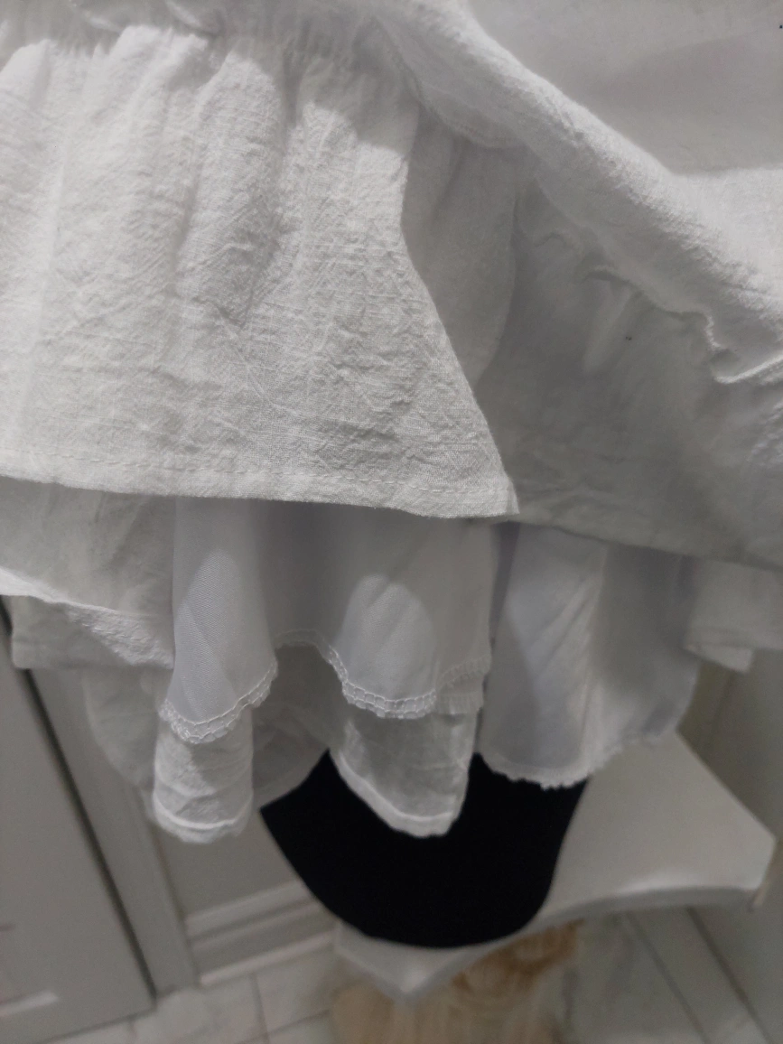 White summer dress with spaghetti straps and a tiered skirt. Elastic smocked waistband.