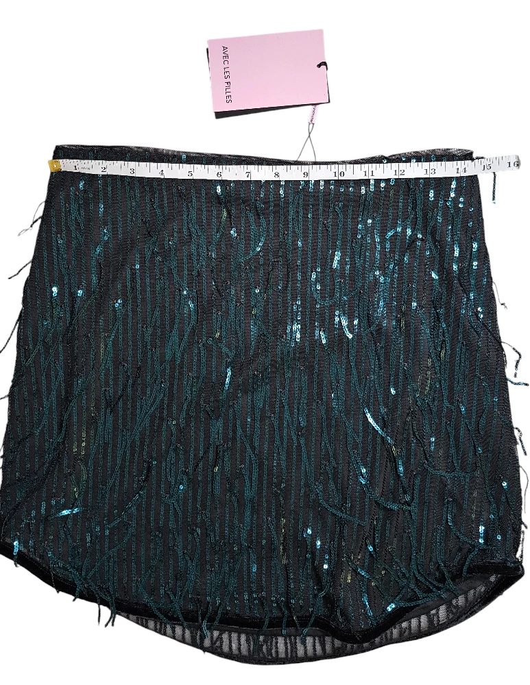 *** PICK-UP AT BROADVIEW & DANFORTH AREA *** Brand new with tags! Size: small Colours: teal & black Lined: yes Think Christmas party, New Year's Eve party, wedding guest, bacheorette party, girls night out, Swiftie party Teal or dark green sequins on long fringes throughout the skirt. When you move, the skirt dances! Black velvet piping so it feels smooth on your legs. Measurements, materials, and care instructions included in photos. My home is pet-free and smoke-free.