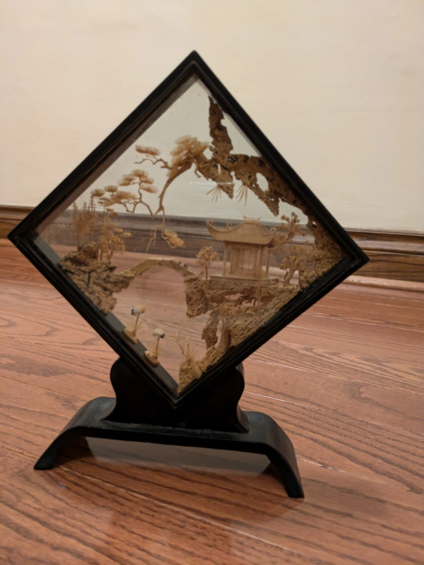 Cork sculpture in a diamond shaped frame with a wooden stand. Depicts a pagoda and trees.