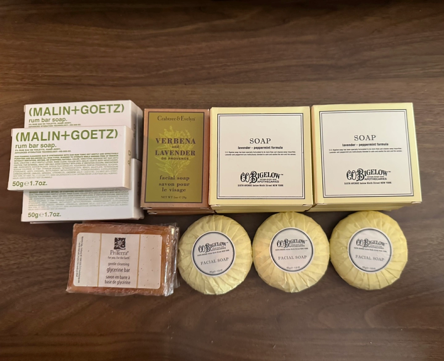 Bundle of fragrant soap bars including Malin+Goetz, Crabtree & Evelyn, and C.O. Bigelow.
